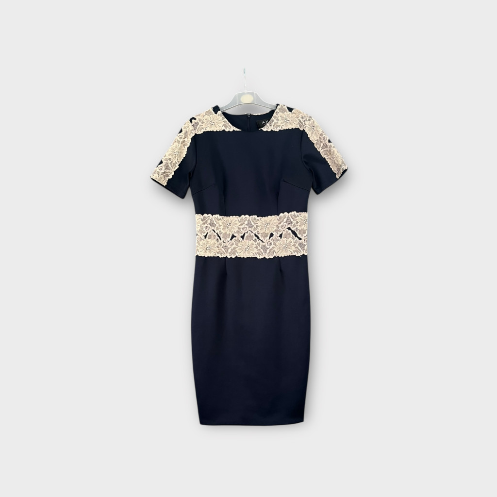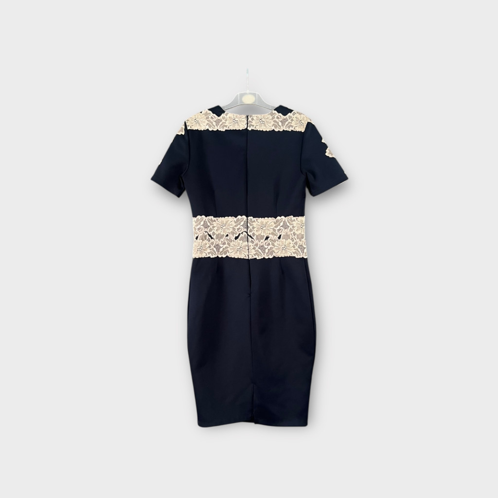 Sötétkék, csipkedíszes, testhezálló női ruha M-es méretben.