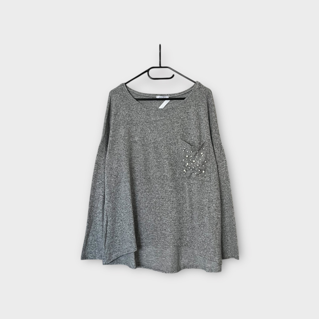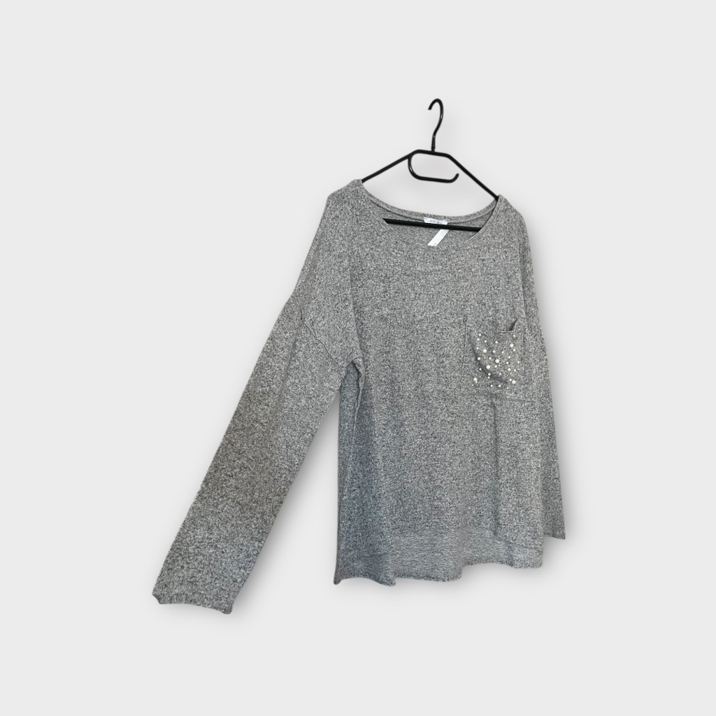 Bő fazonú, gyöngyökkel díszített női pulóver L-es méretben.