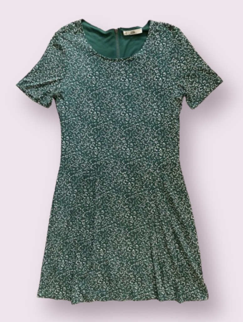 Zöld alapon apró virágos, bélelt ruha S-es méretben.