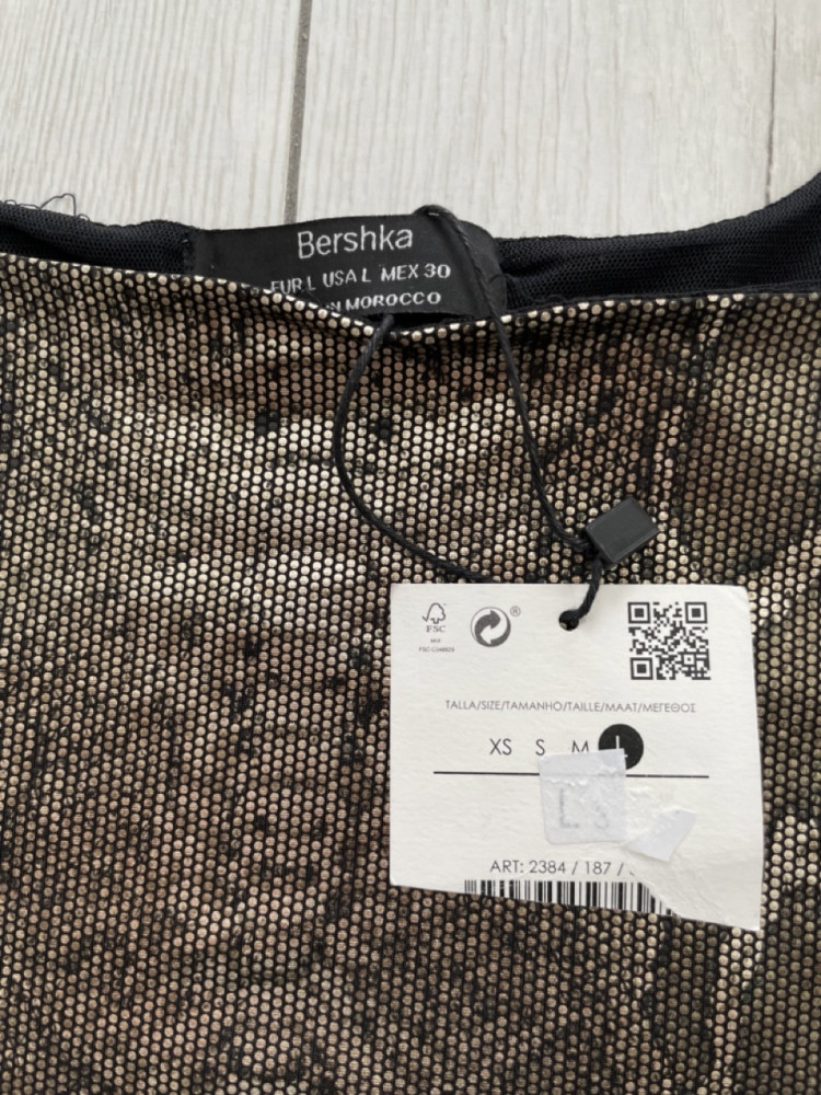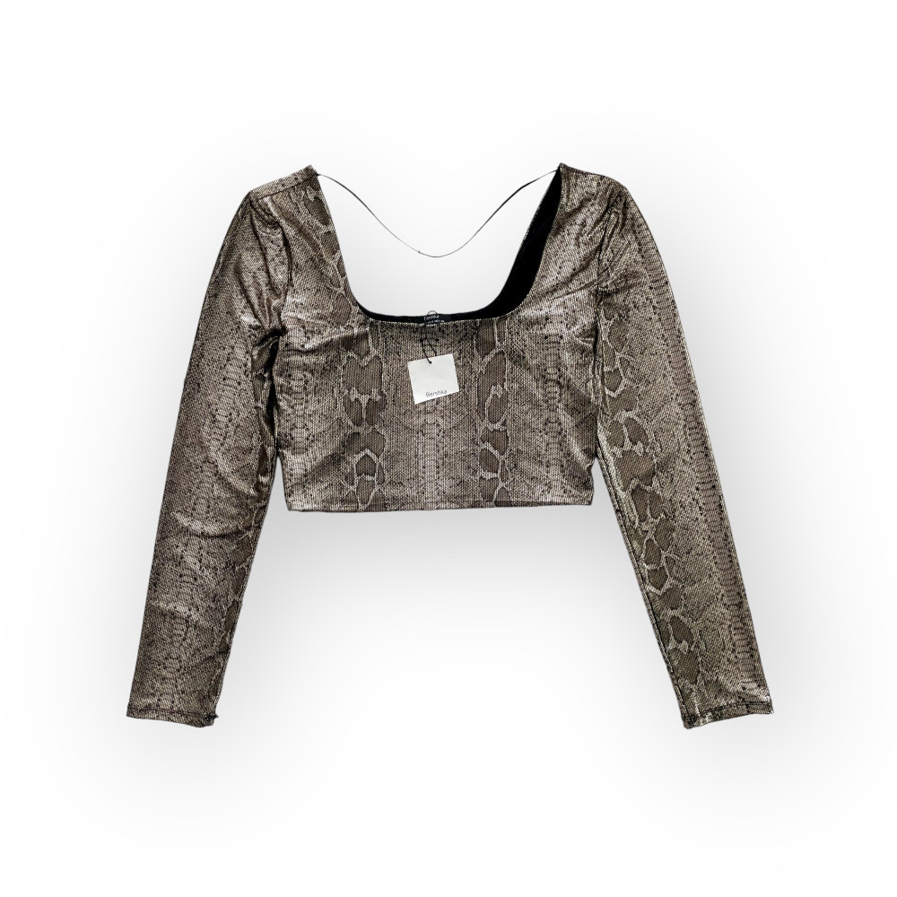Csillámló, rövidfazonú, kígyómintás női top L-es méretben.