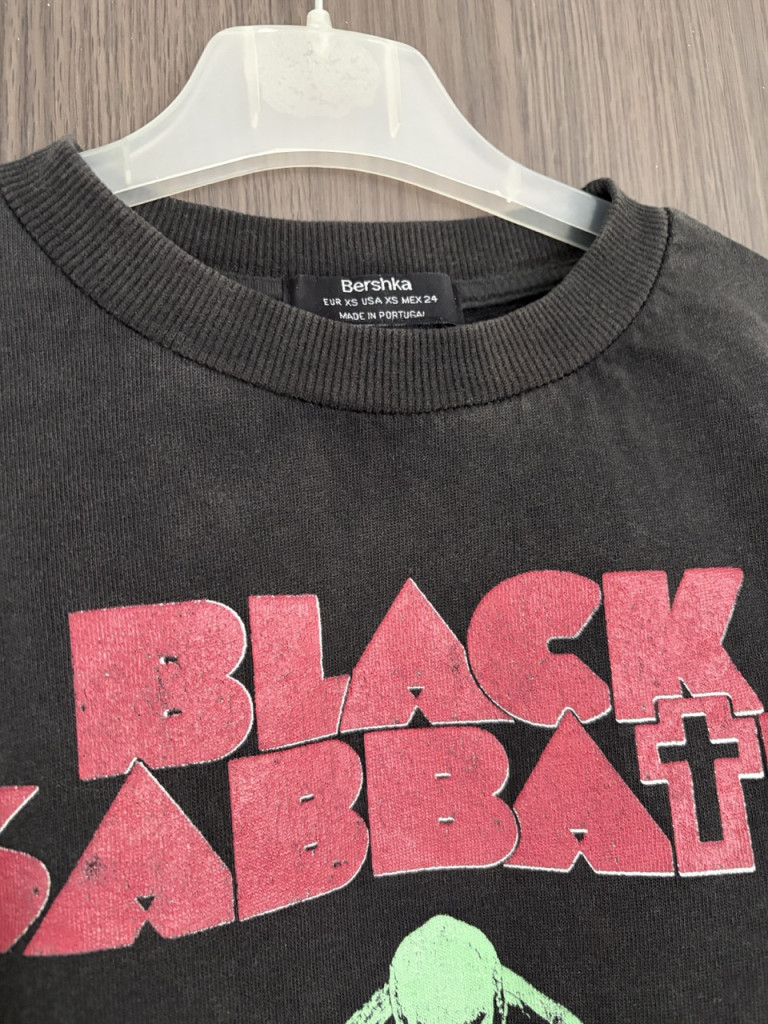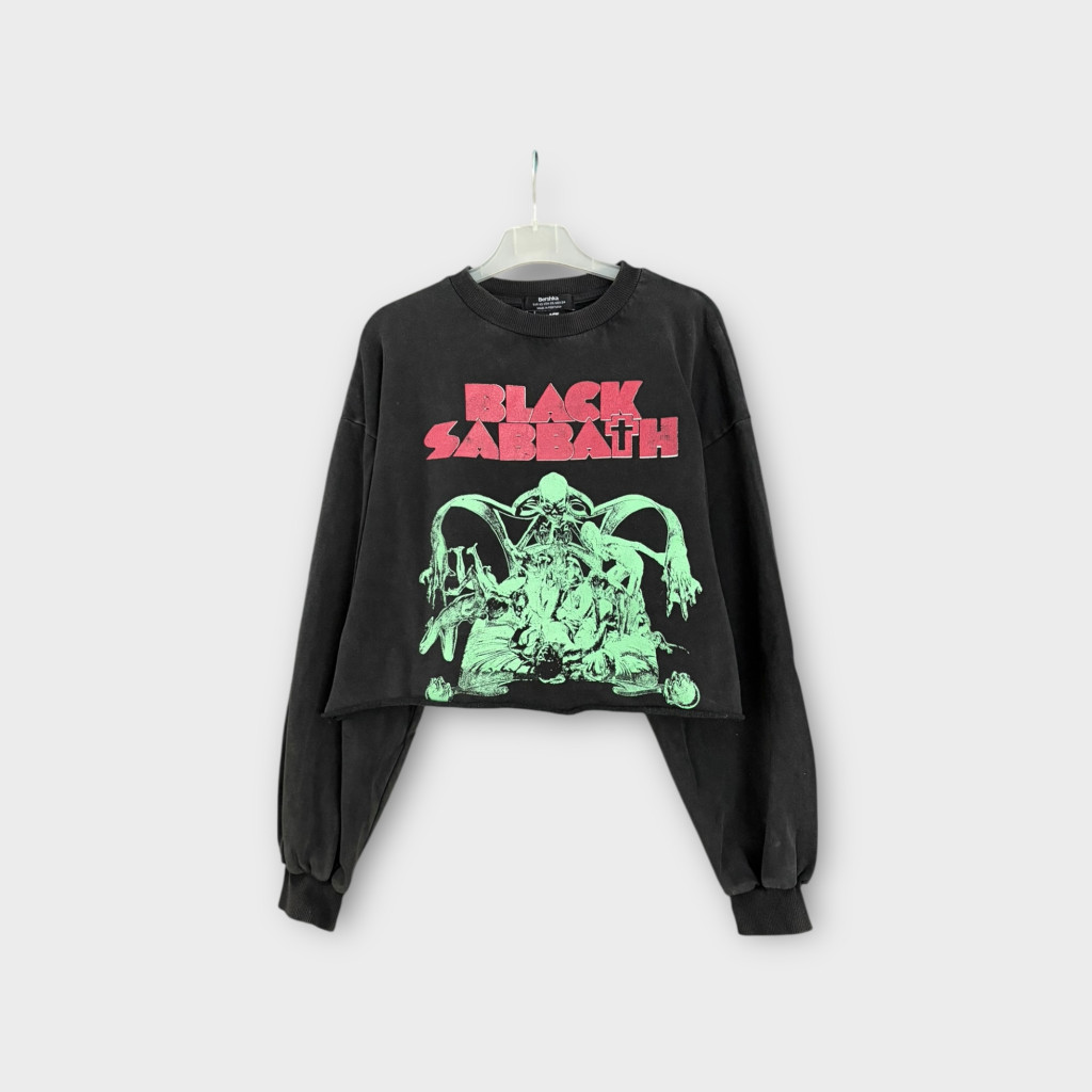 Black Sabbath mintás, rövid fazonú női pulóver.