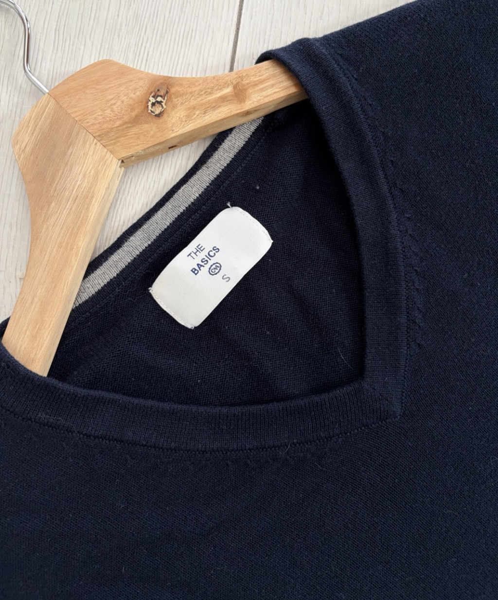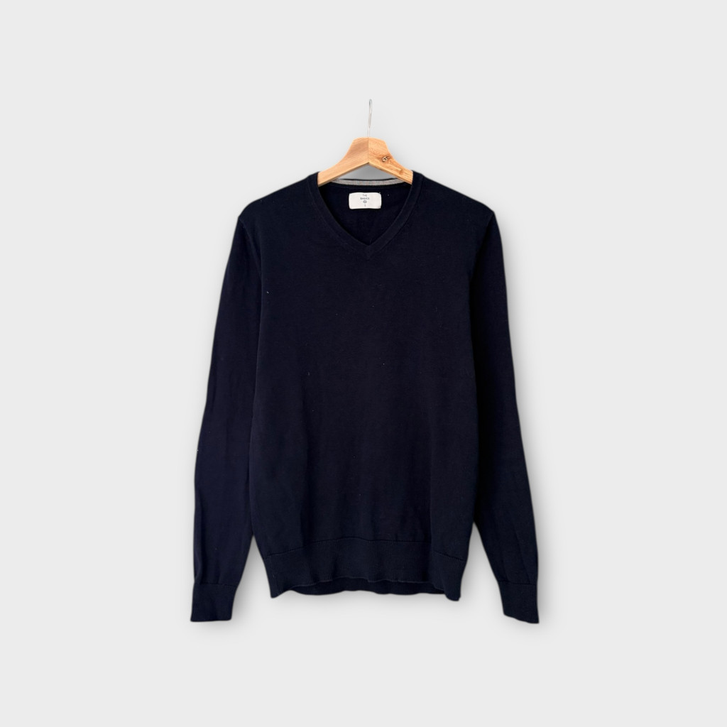 Sötétkék, finomkötött férfi pulóver S-es méretben.