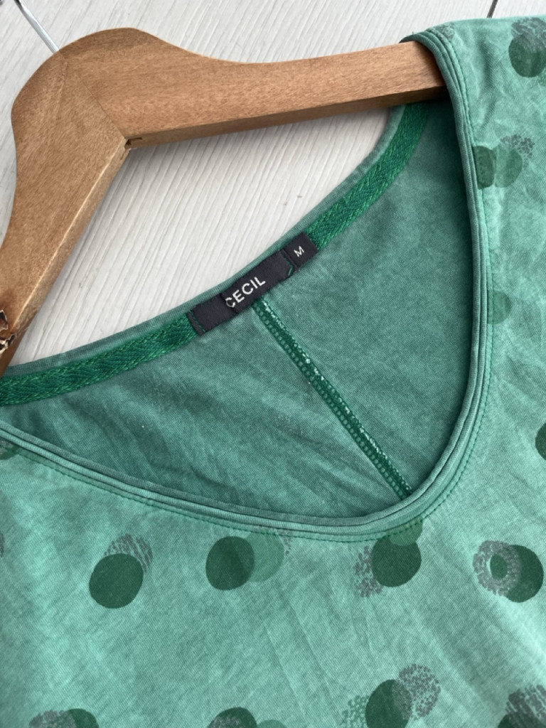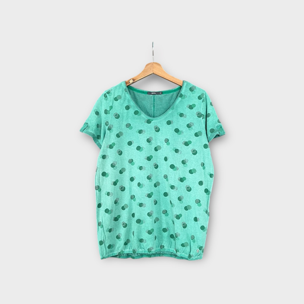 Koptatott hatású, pöttyös női póló M-es méretben.