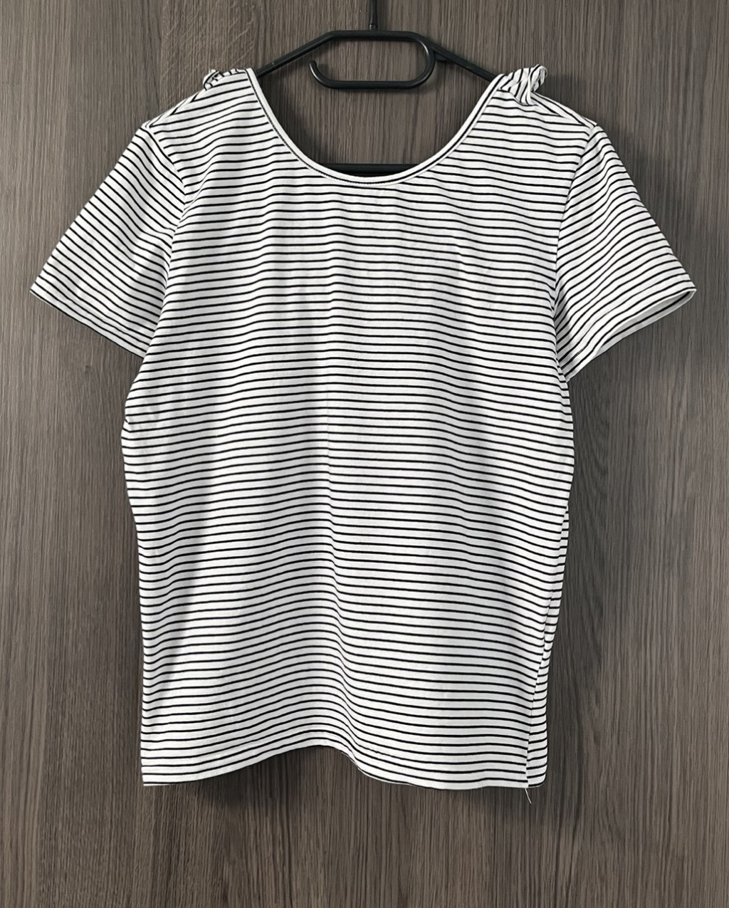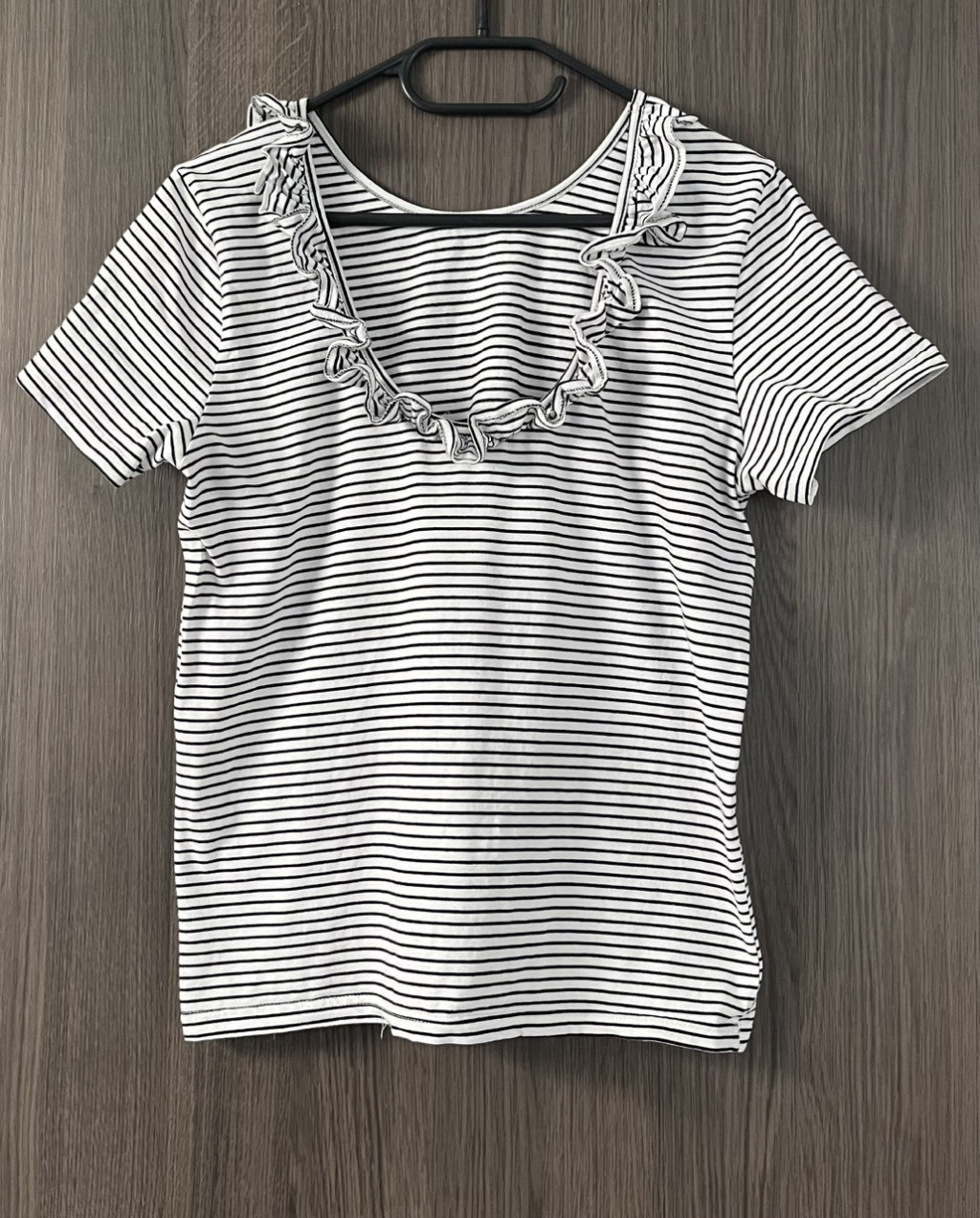 Hátul mélyen dekoltált, fodros női póló M-L-es méretben.