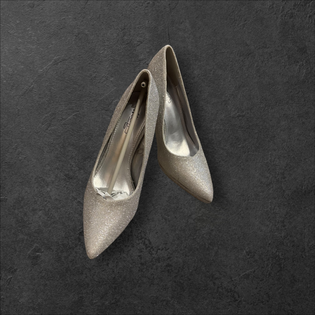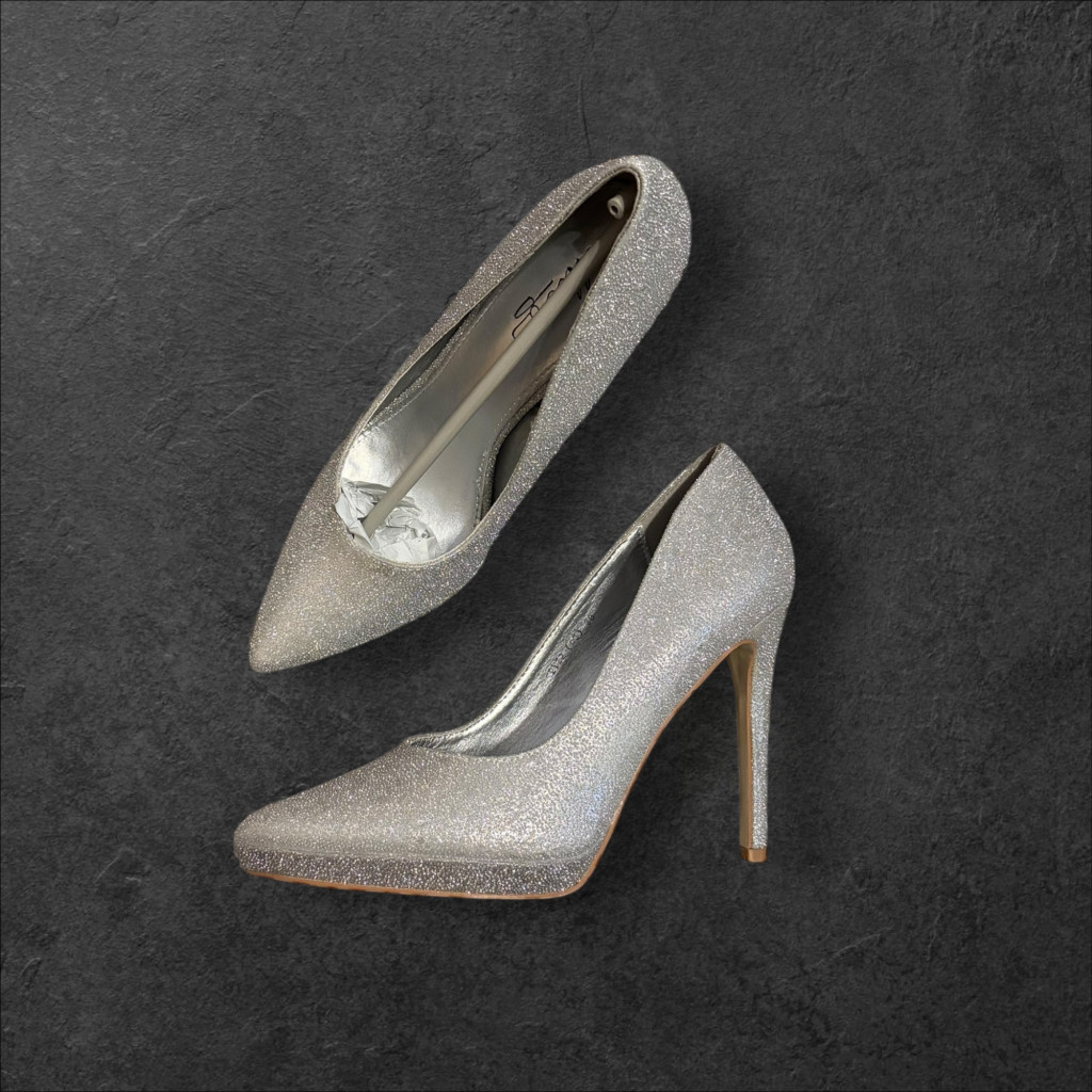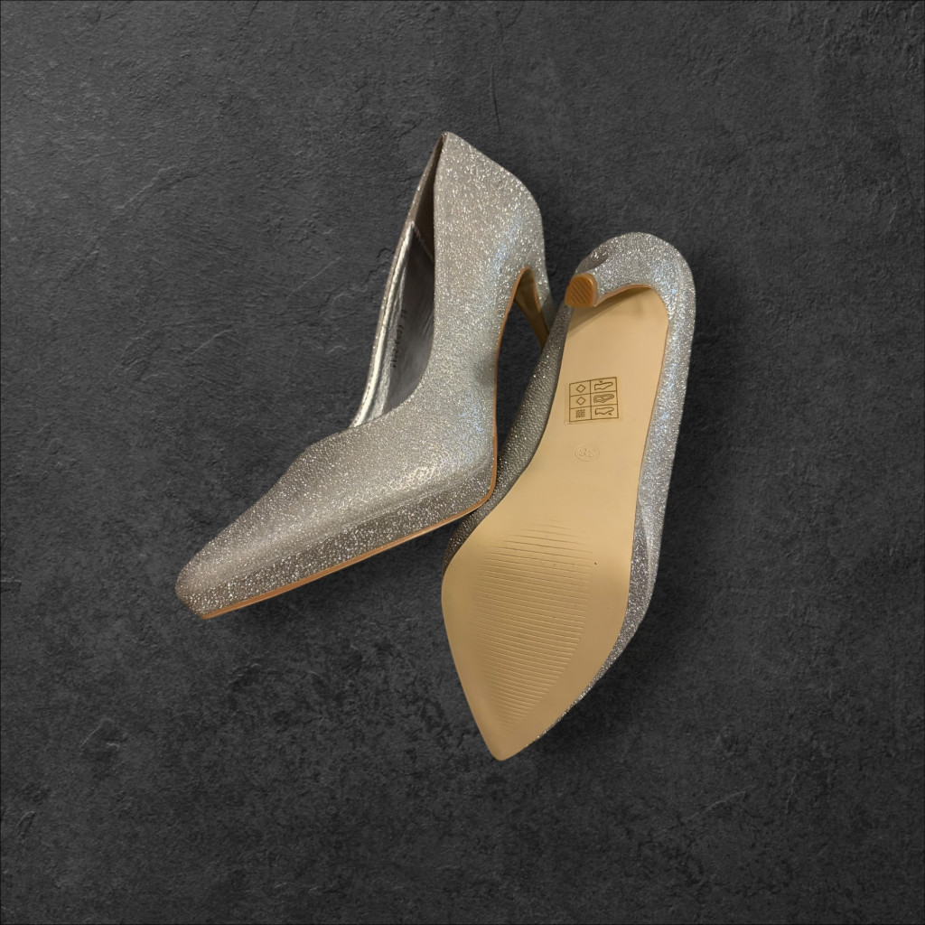 Gyönyörű, ezüst színű, csillogó női magassarkú cipő 38-as méretben.