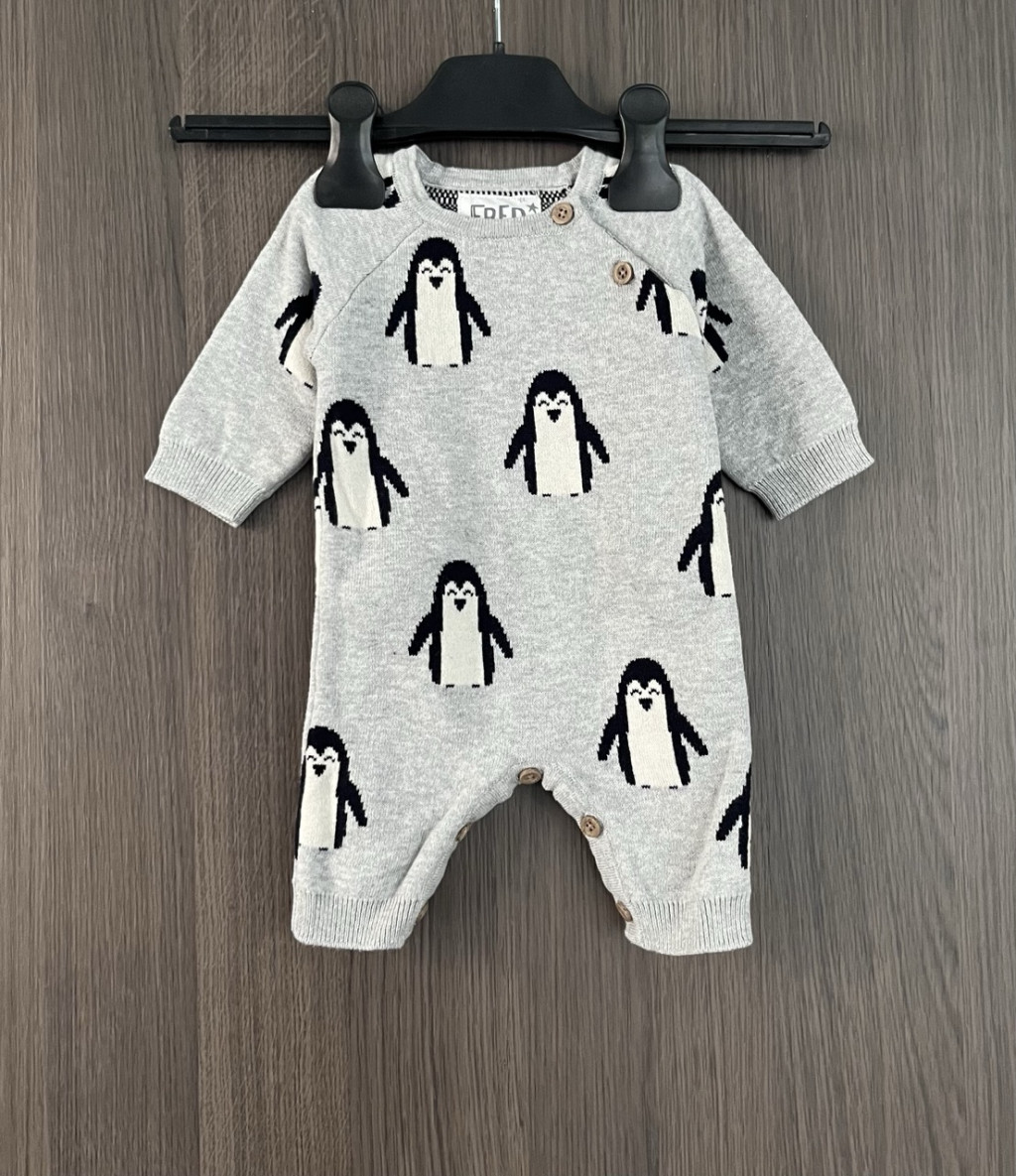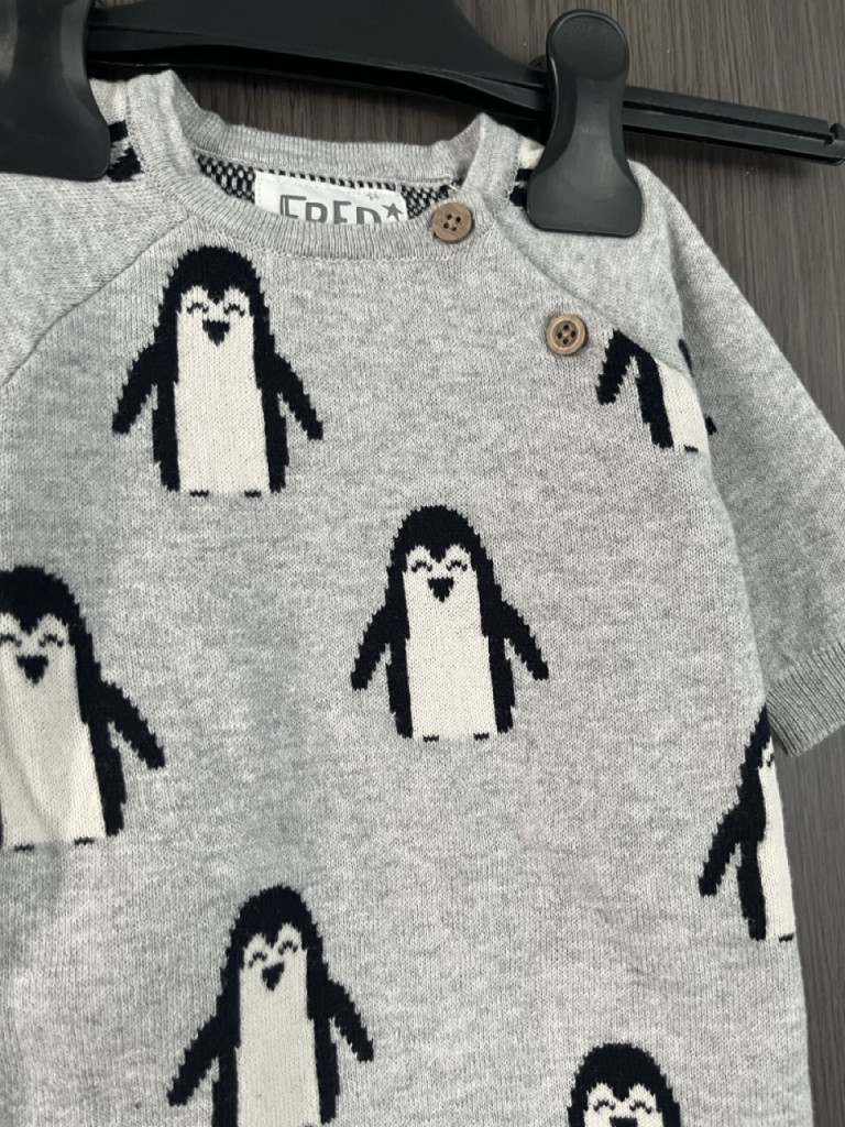 Pingvin mintás, kötött kisfiú rugdalózó.