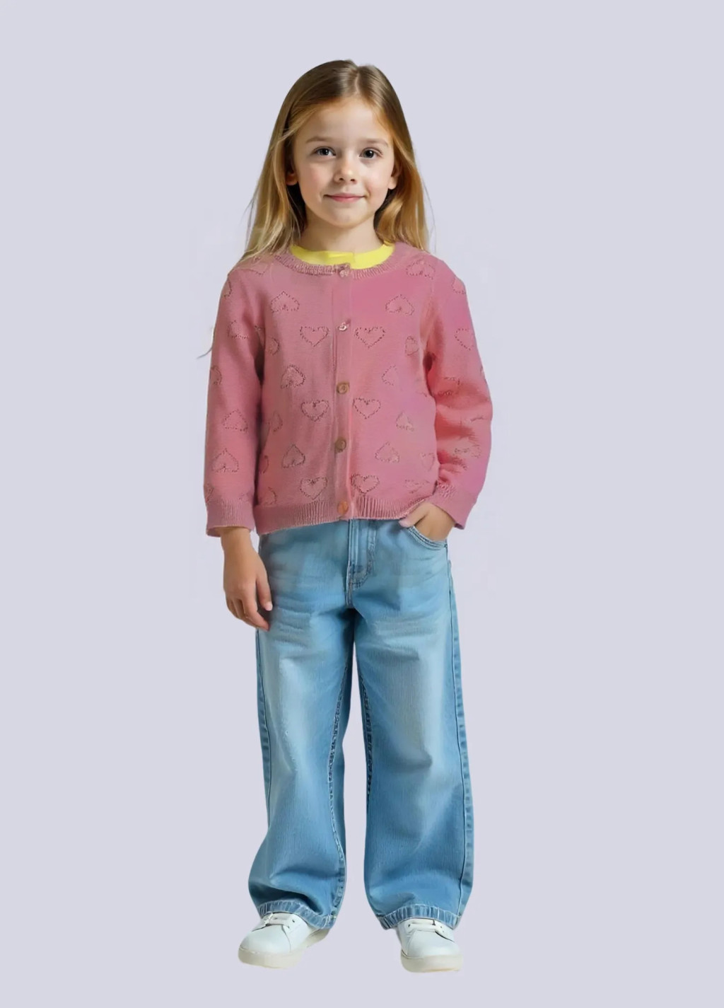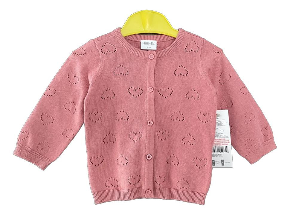 Rózsaszín, lyukmintás kislány kardigán 74-es méretben.