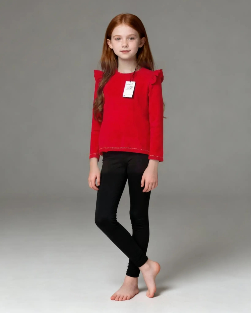 Arany cérnával szegett, fodros, piros lányka felső 140-es méretben.