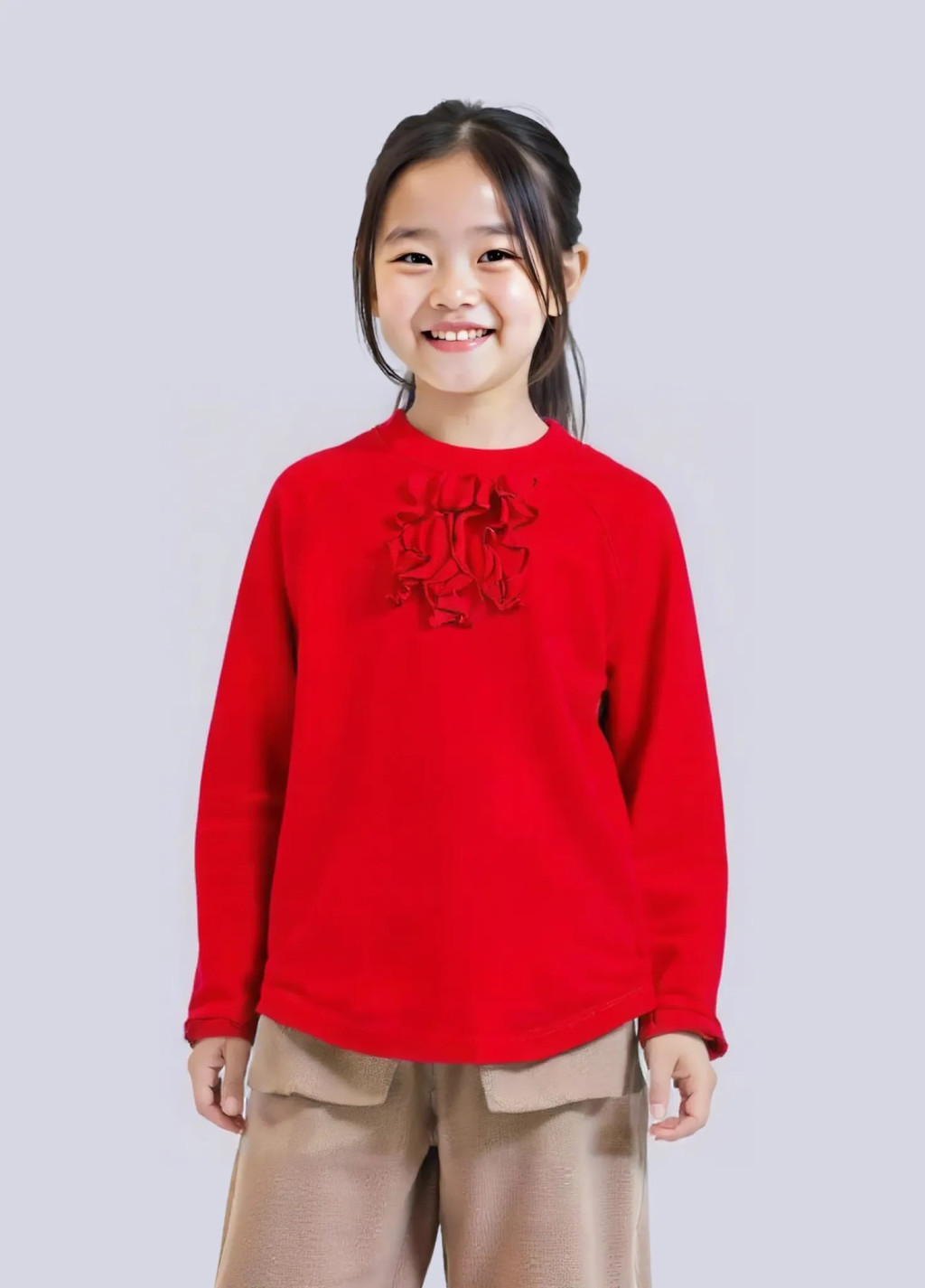 Elöl és ujján fodrokkal díszített, belül kellemesen puha pulóver. Anyaga 100% pamut. Hossza: 45 cm, ujja hossza nyaktól: 40 cm, szélessége: 34 cm.