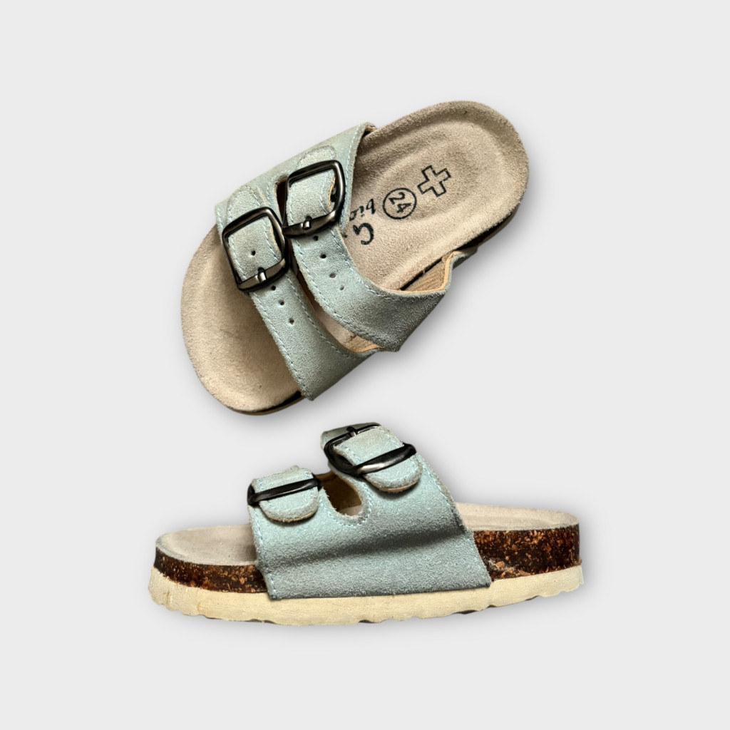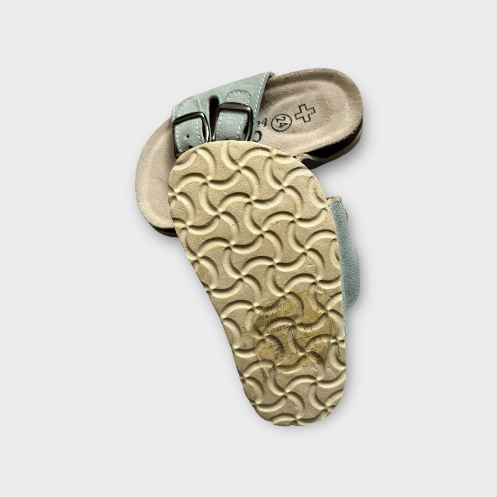 Világoskék kis bőrpapucs 24-es méretben.