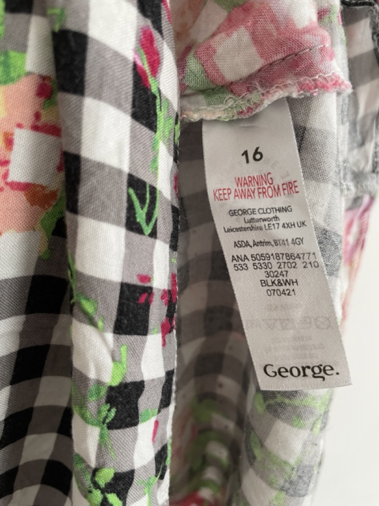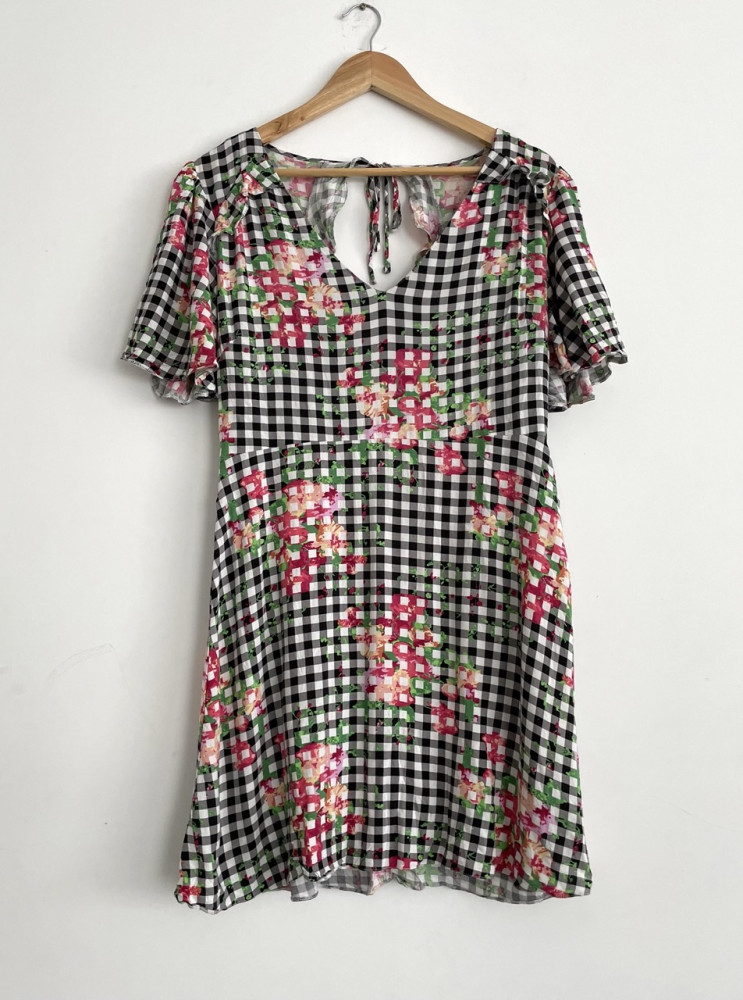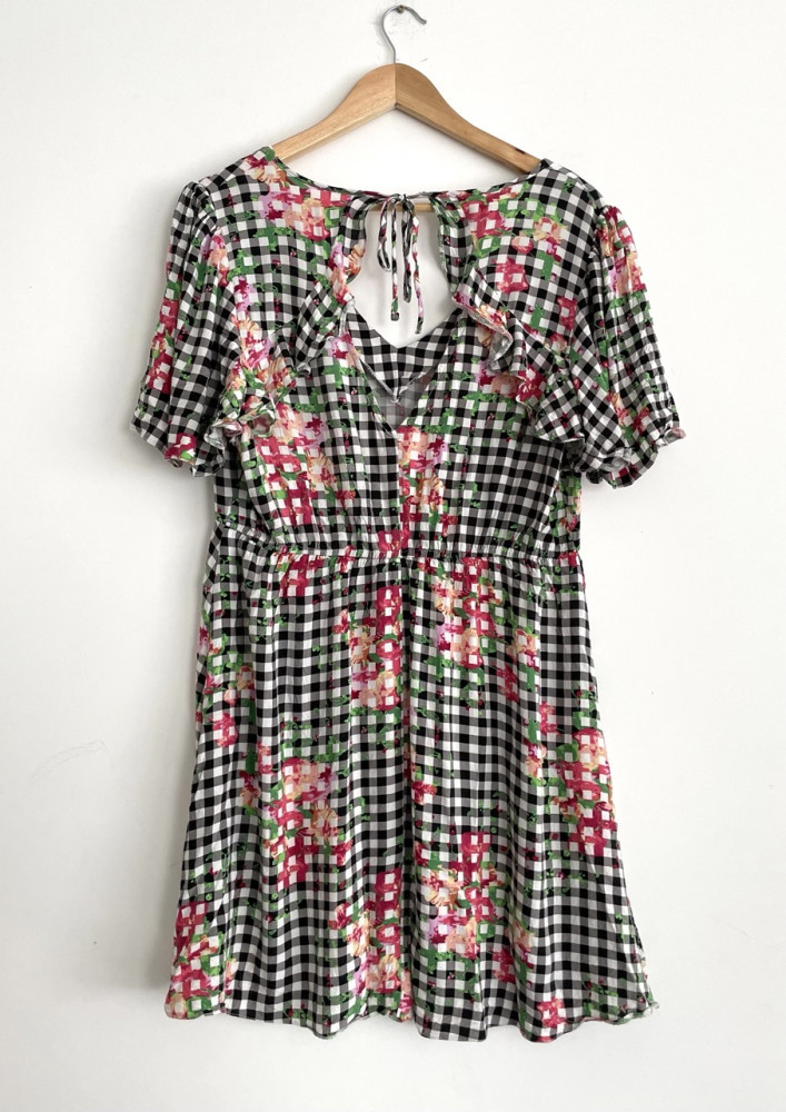 Fodros, nyitott hát kockás-virágos női ruha L-es méretben.