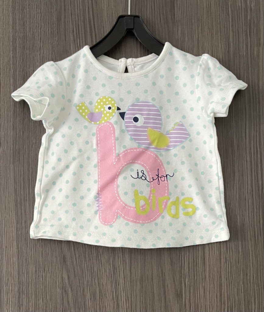 Pöttyös-madárkás kislány póló 68-as méretben.