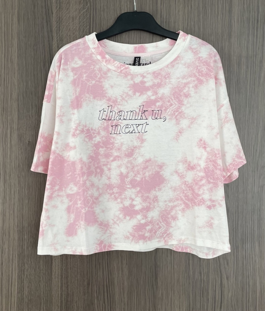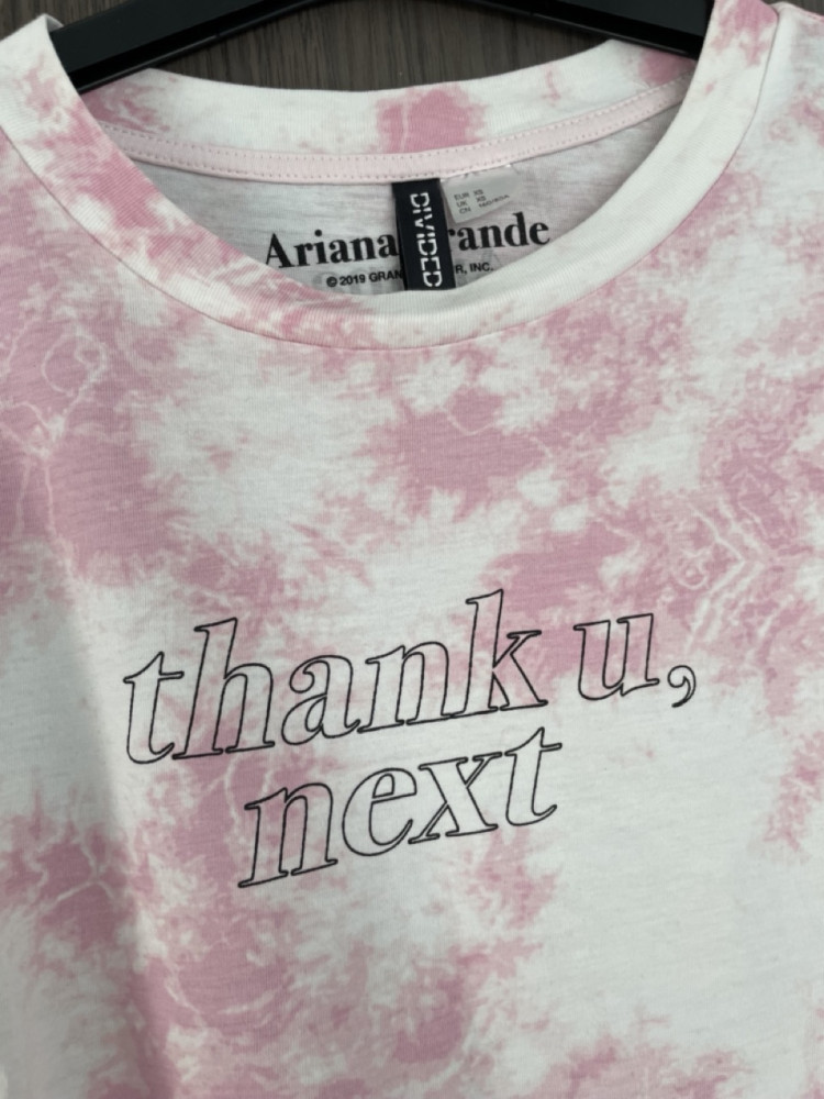 Rövid fazonú, batikolt hatású, Ariana Grande női póló XS-es méretben.