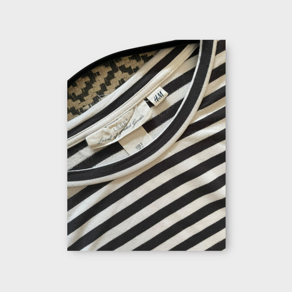 Vastagabb anyagú, csíkos női felső S-es méretben.