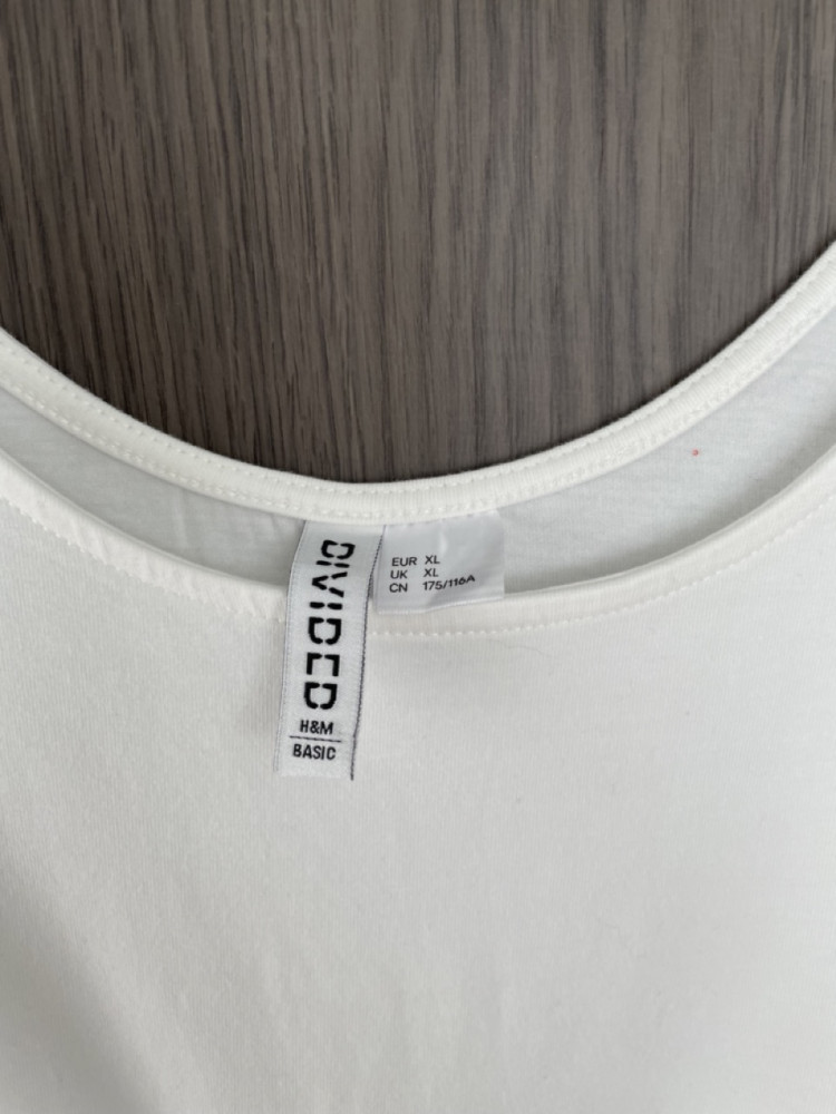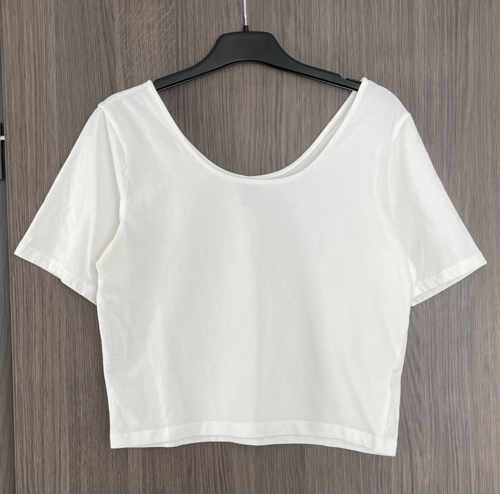 Rövid fazonú, fehér színű női póló XL-es méretben.