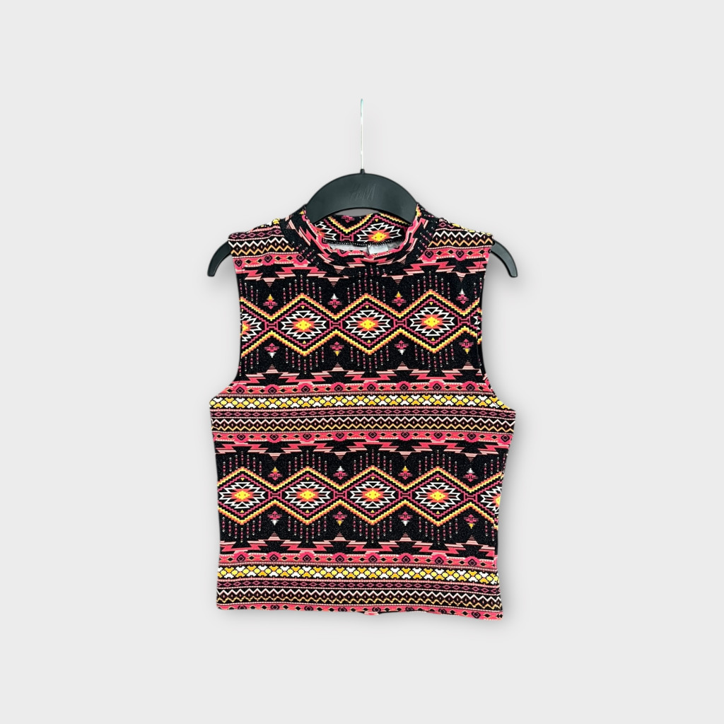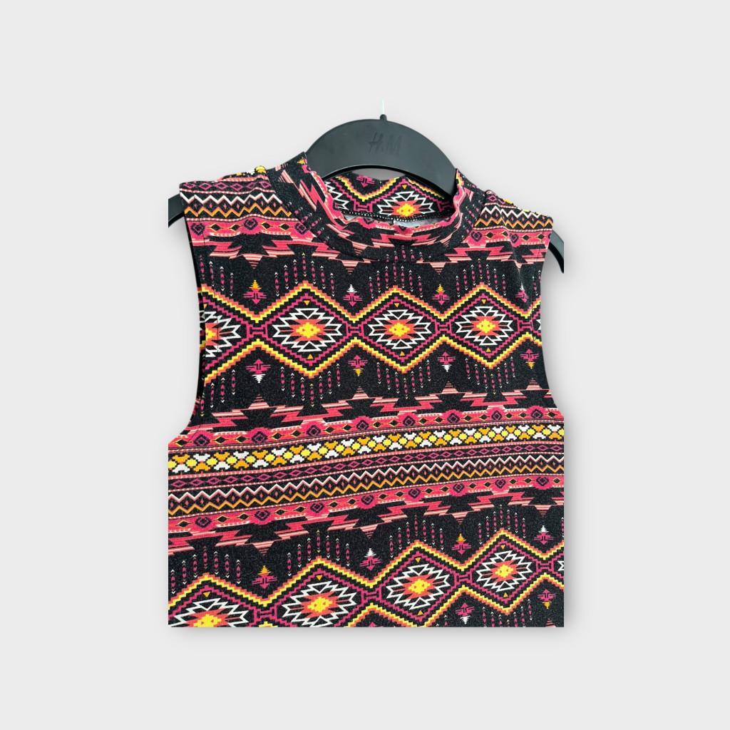 Magasított nyakú, mintás női felső S-es méretben.