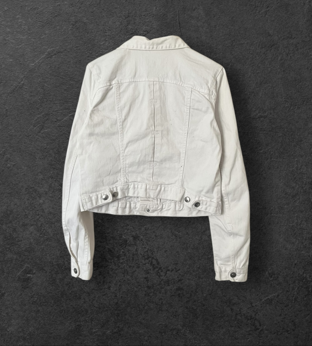 Fehér színű, rugalmas anyagú női farmerdzseki. Kisebb L-es méret, inkább M-re ajánljuk.
