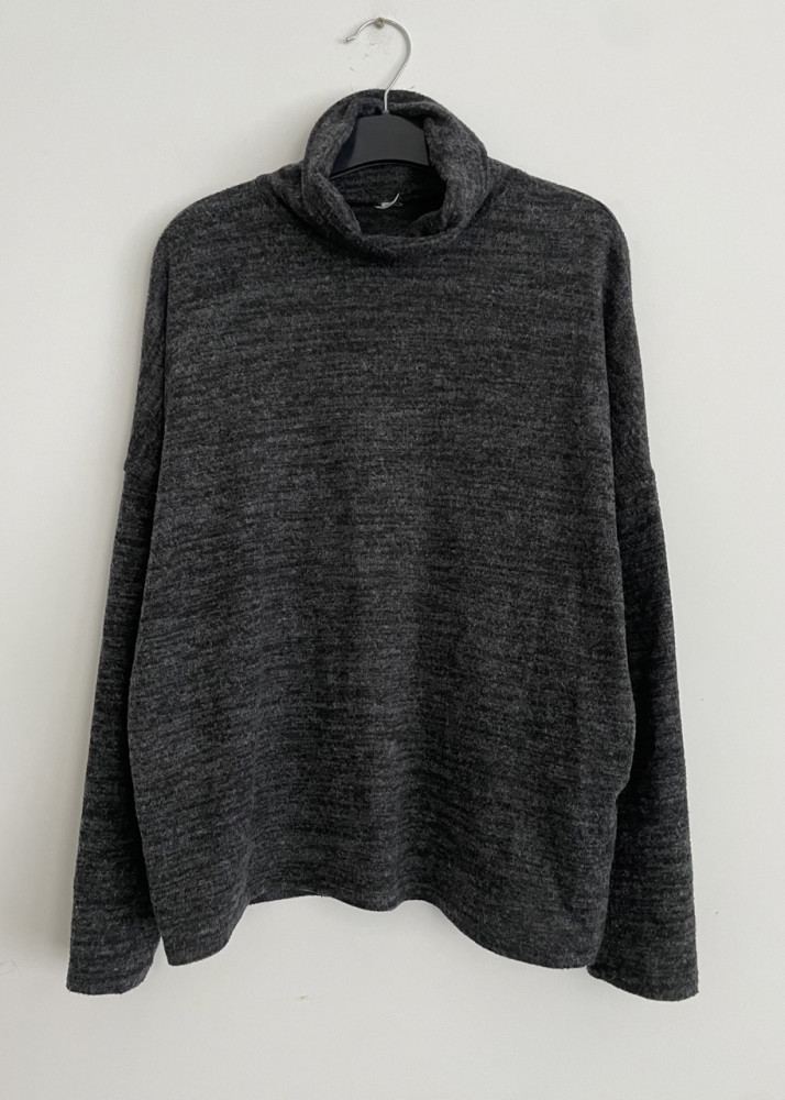 Bolyhozott anyagú, sötétszürke női pulóver S-es méretben.