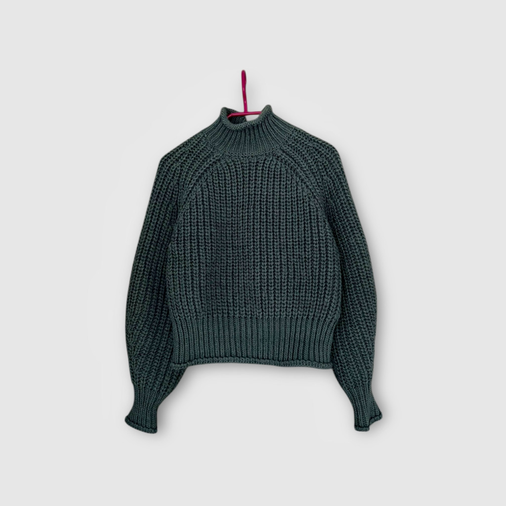 Vastag kötött pulóver S-es méretben, különleges szürkés-zöld színben.