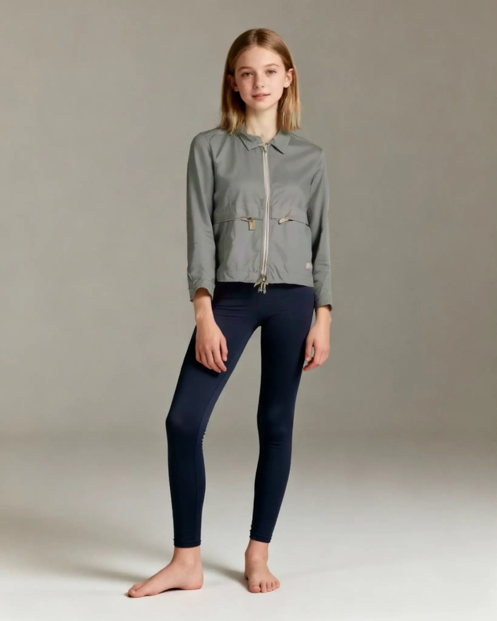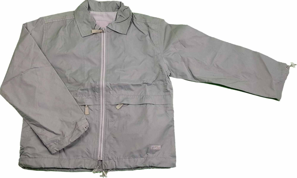 Elöl cipzárral nyitható, hálós bélésű, vékony és könnyű kabát. Ujja vége és alsó szegélye gumival szűkíthető.