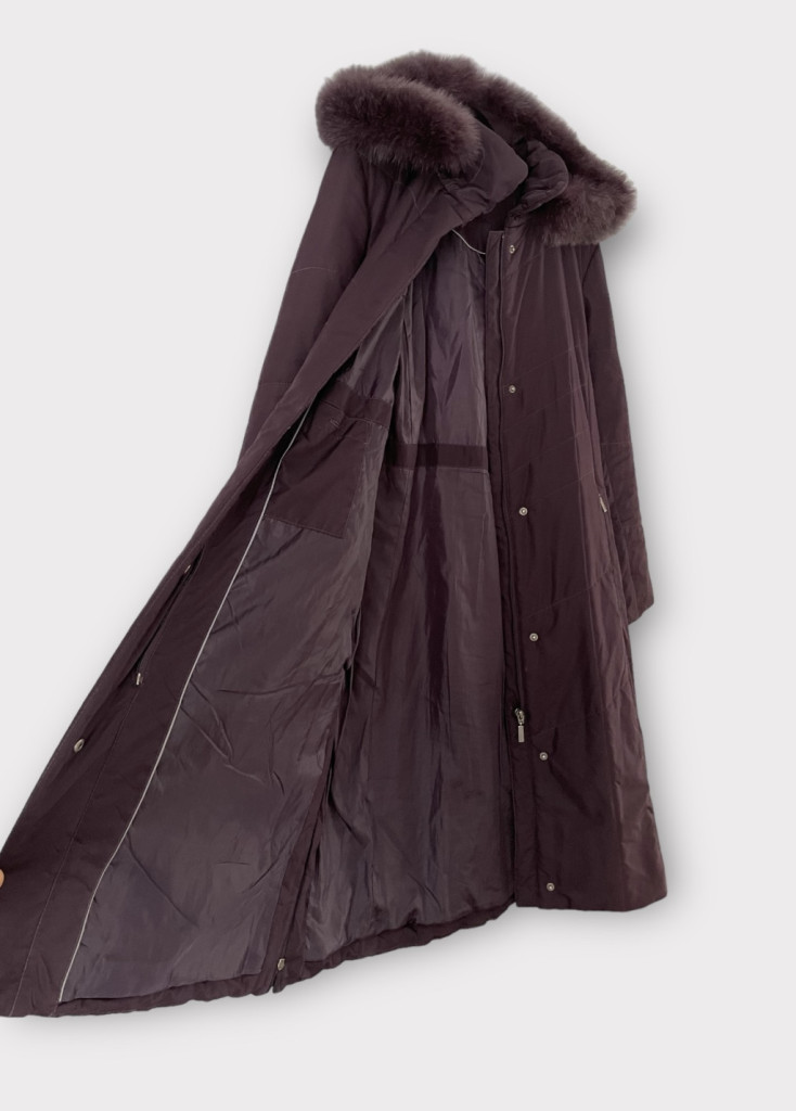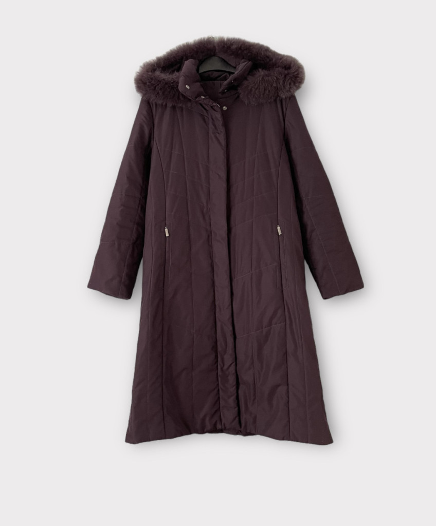Sötétlila, hosszú női téli kabát 36-os méretben.