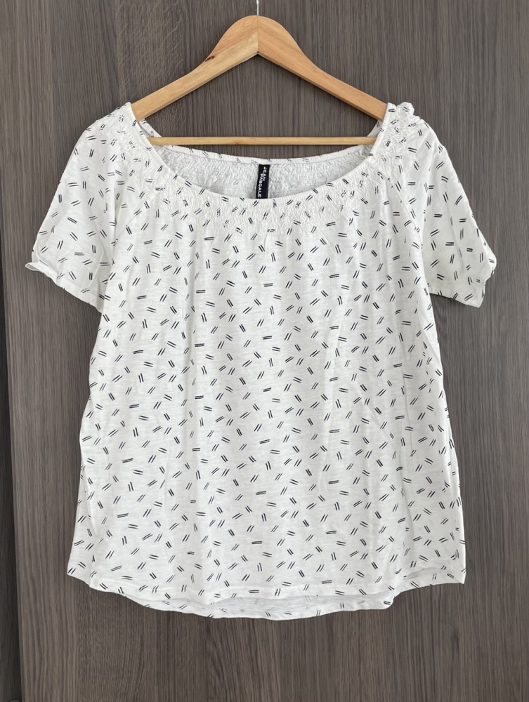 Fehér alapon mintás női póló M-es méretben.