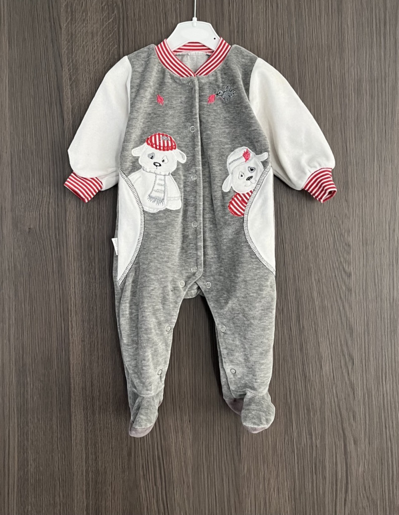 Kiskutyákkal díszített kisfiú rugdalózó 62-es méretben.