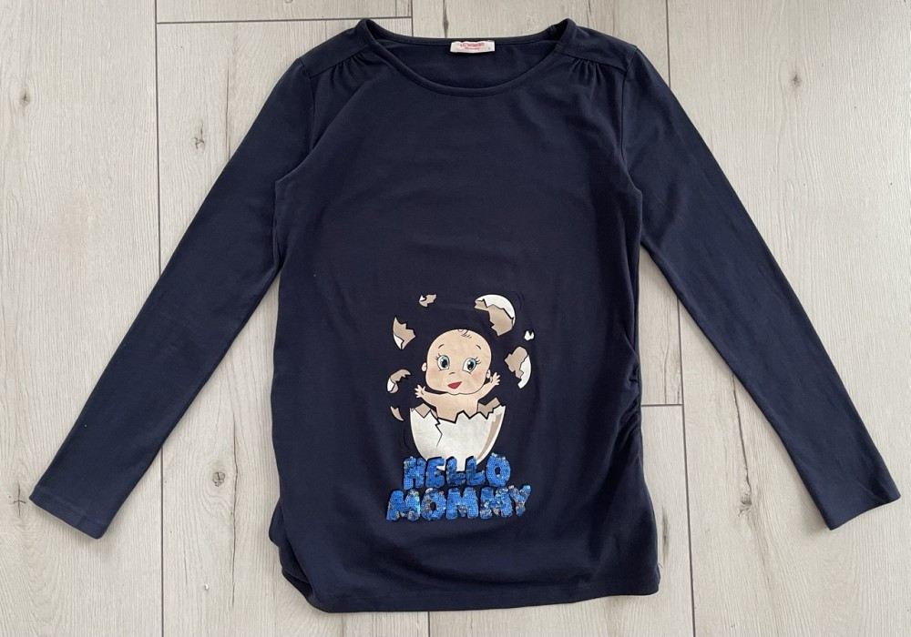 Sötétkék kismama felsőrész nyomott mintával, S-es méretben.