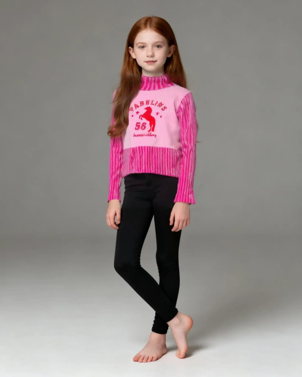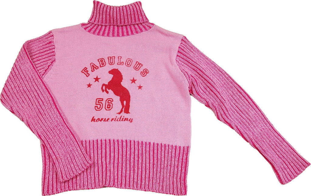 Magas nyakú, bársonyos mintás, kötött pulóver. „Mesés lovaglás” felirat díszíti. Anyaga 100% pamut. Hossza: 44 cm, ujja hossza nyaktól: 52 cm, szélessége: 38 cm.
