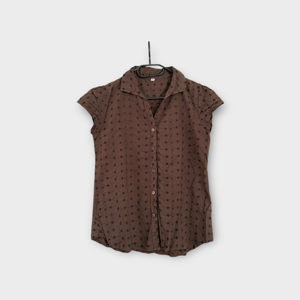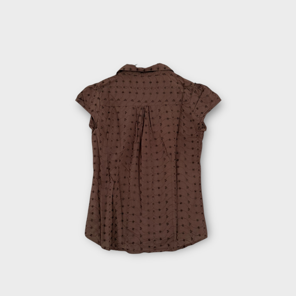Sötétbarna, lyukmintás női blúz.