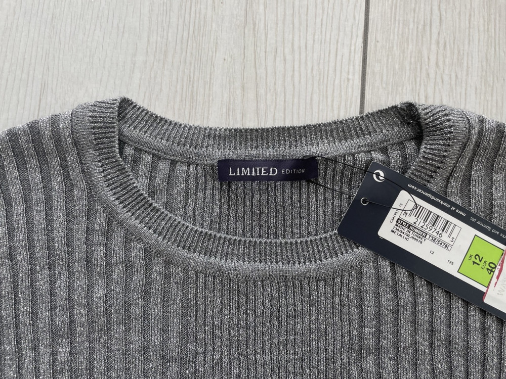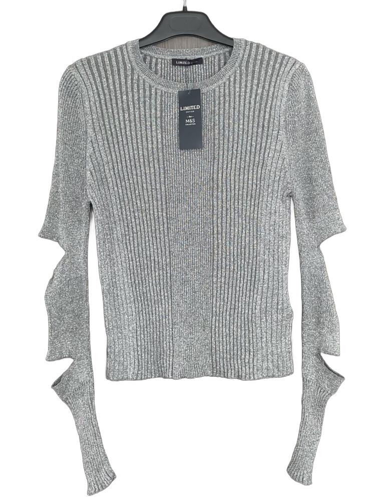 Csillámló, finomkötött, női pulóver különleges ujjakkal, 40-es méretben.