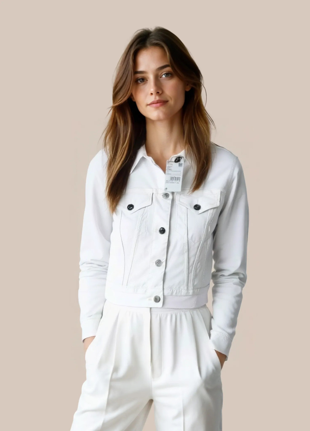 Fehér színű női farmerdzseki kontrasztos gombokkal, S-es méretben.