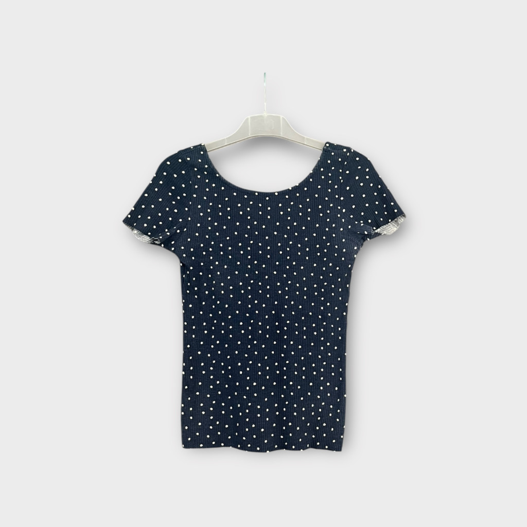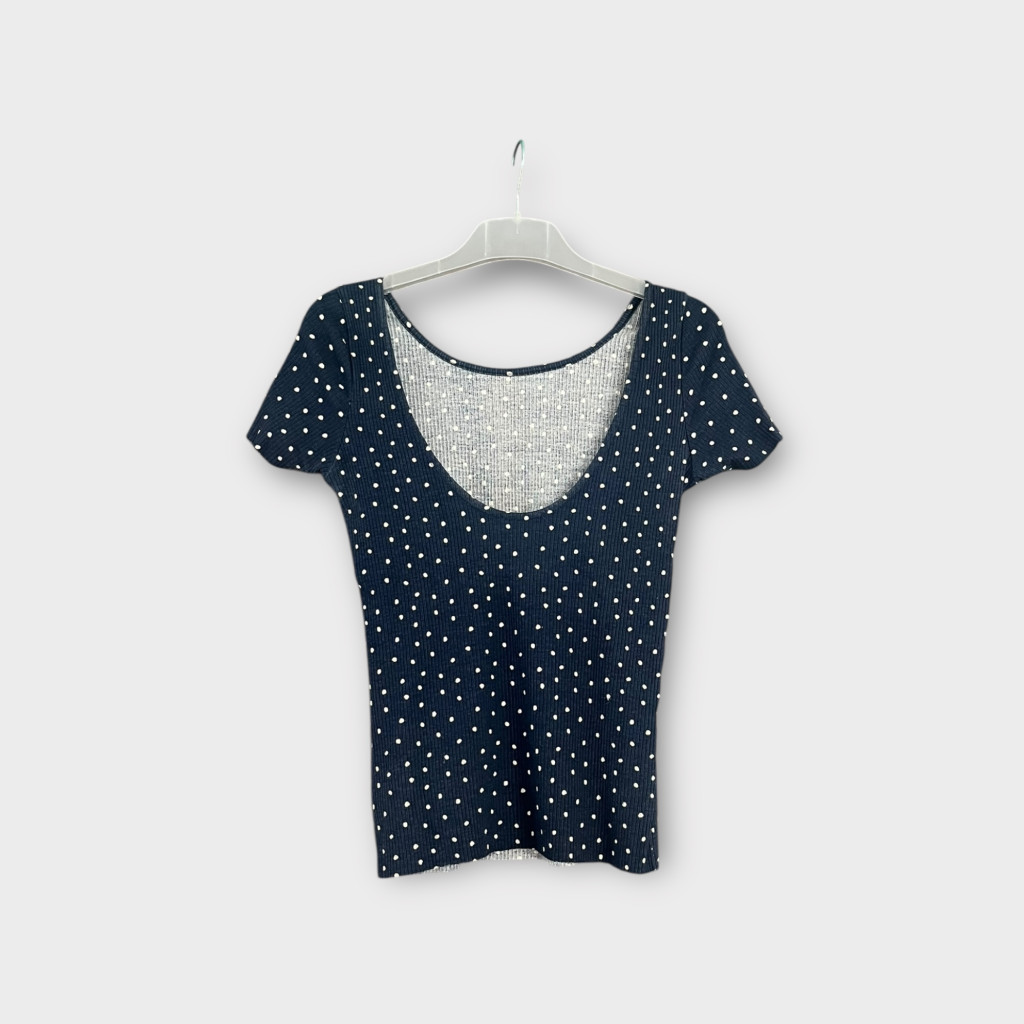 Sötétkék alapon fehér pöttyös női póló S-es méretben.