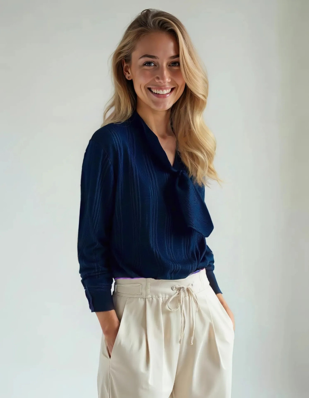 Texturált anyagú, sötétkék női blúz S-es méretben.