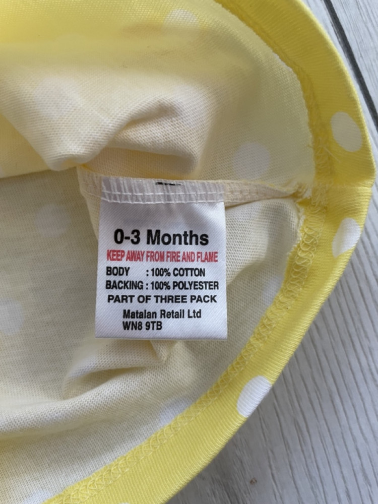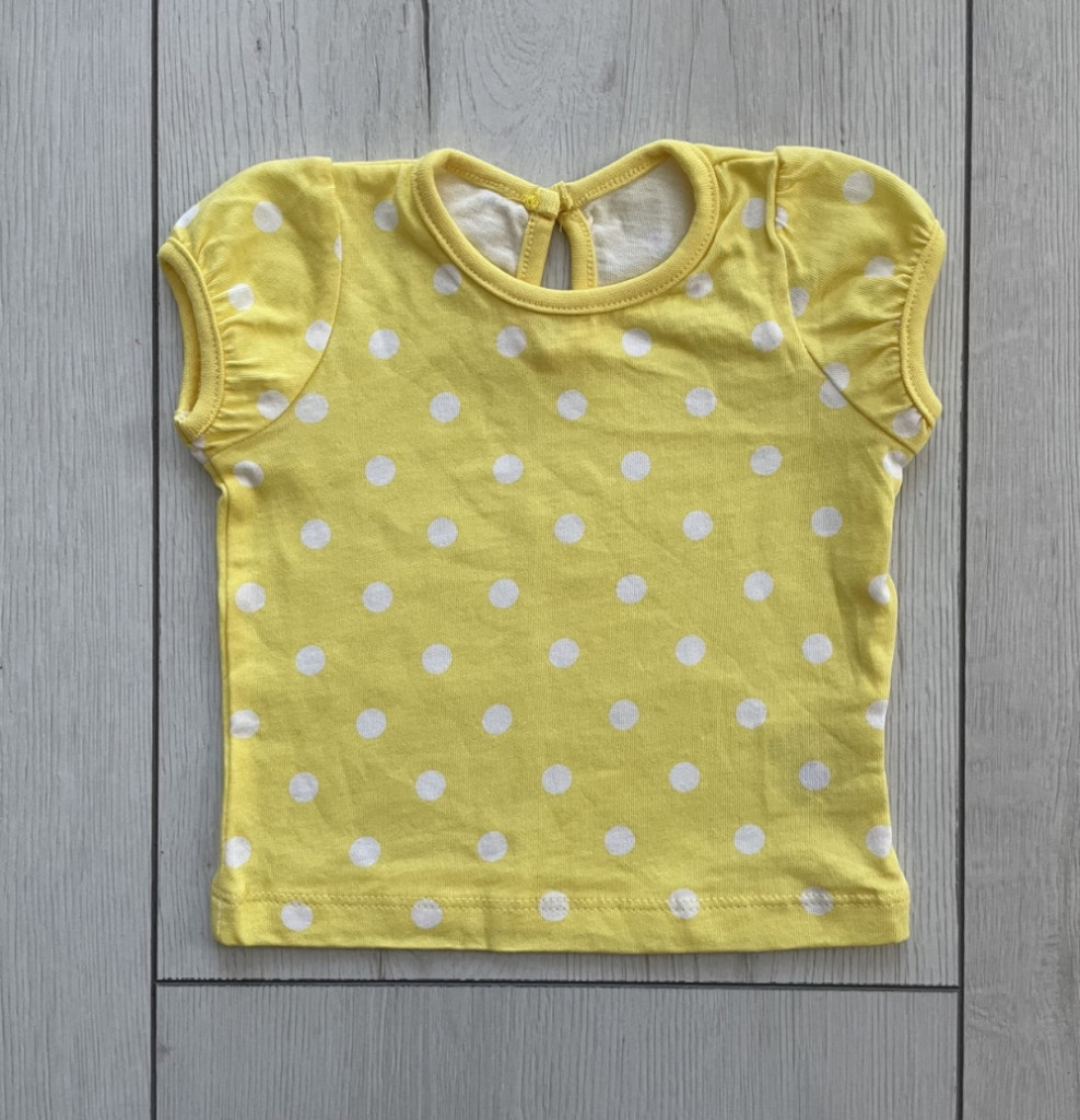 Sárga alapon fehér pöttyös kislány póló 68-as méretben.