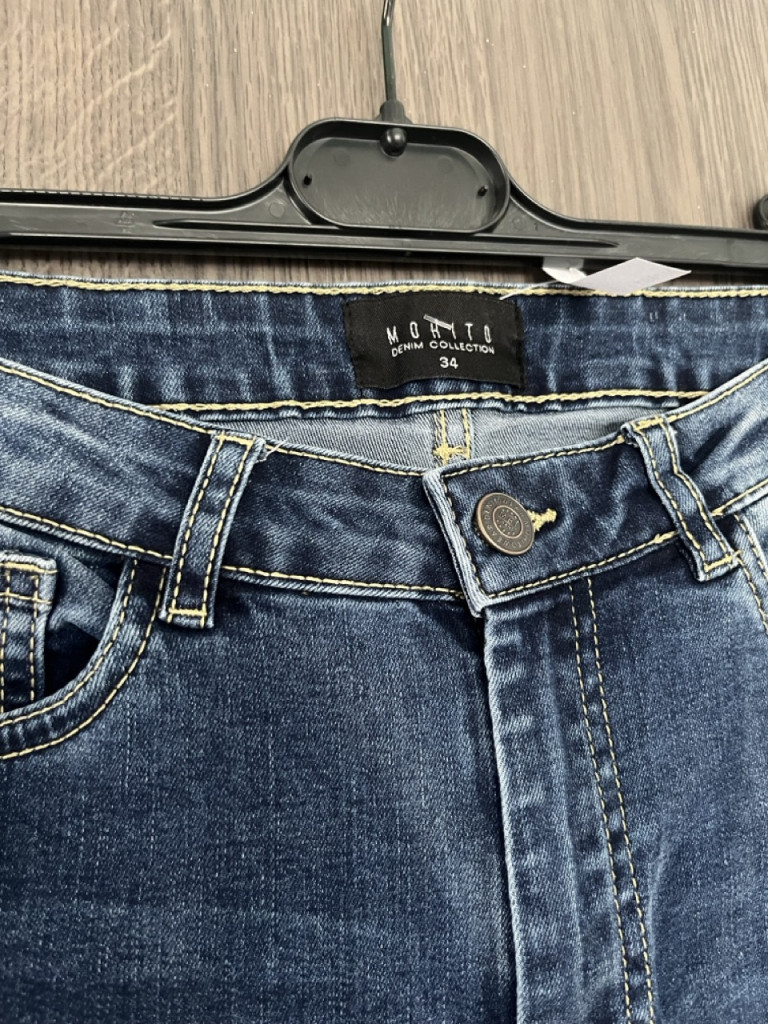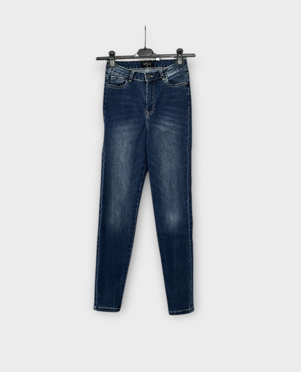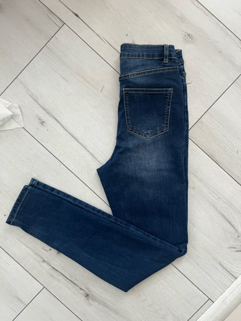 Magas derekú, rugalmas anyagú női farmernadrág XS-es méretben.