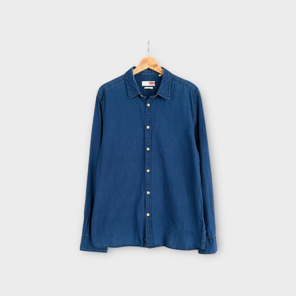 Sötétkék, csíkos férfi ing L-es méretben.