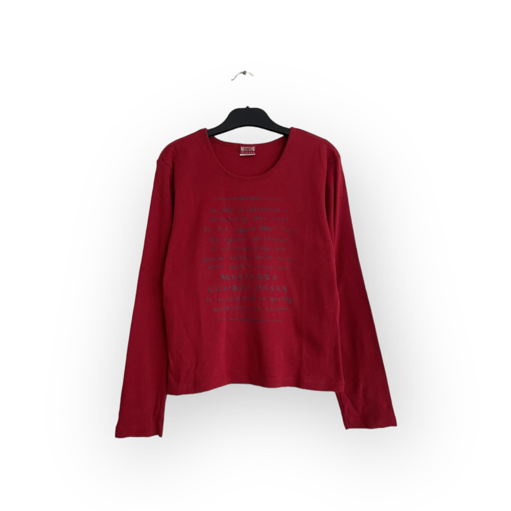 Piros színű, feliratos női felső S-es méretben.
