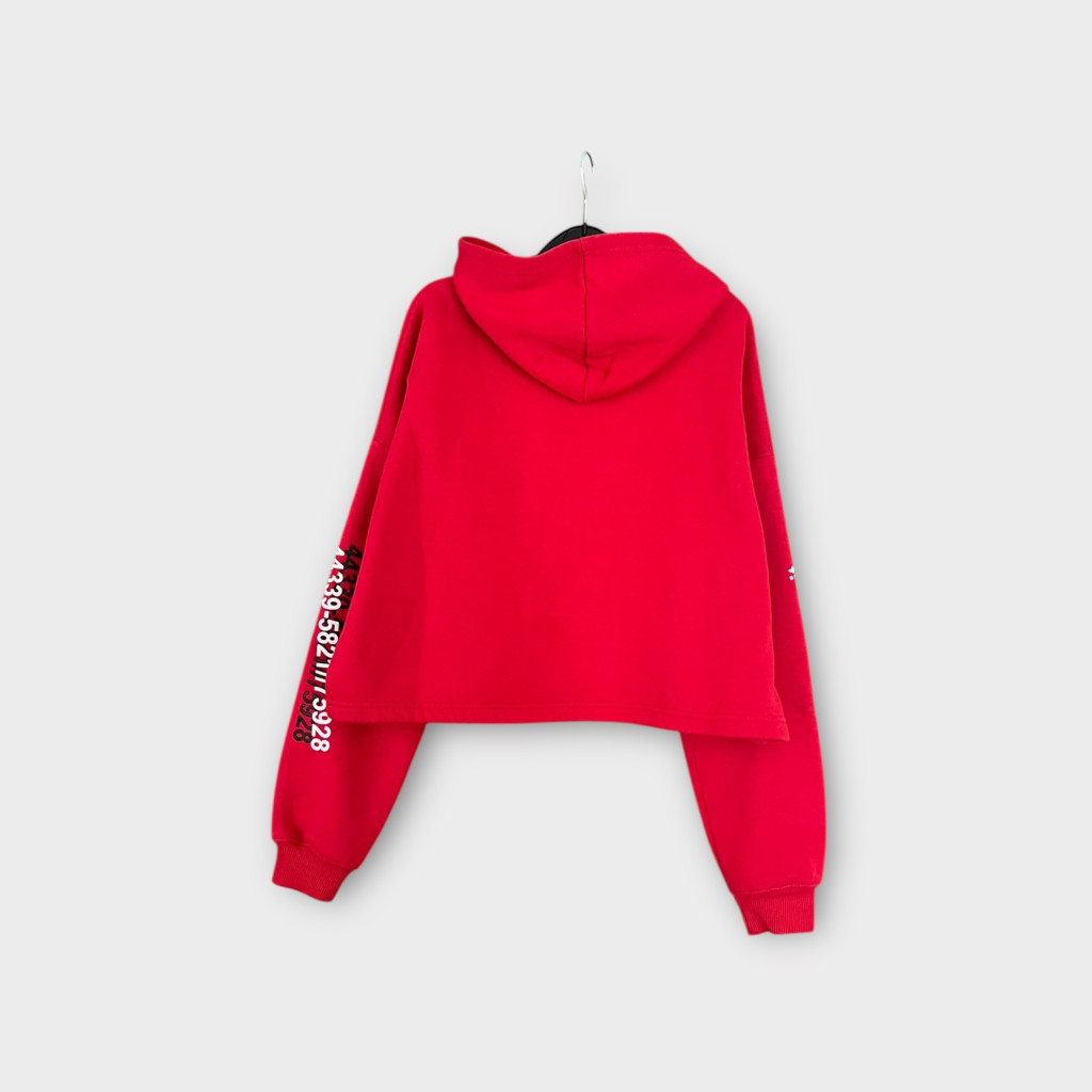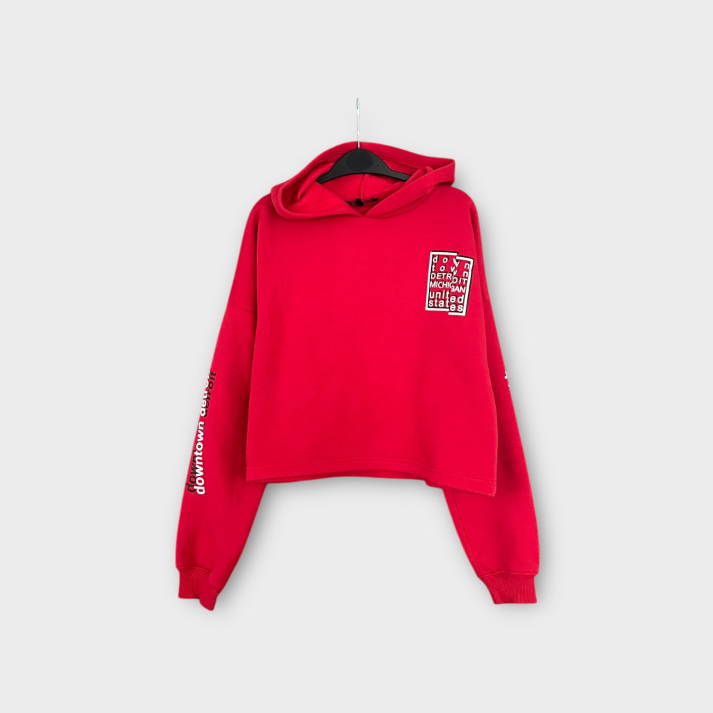 Rövidebb fazonú, piros lányka kapucnis pulóver.