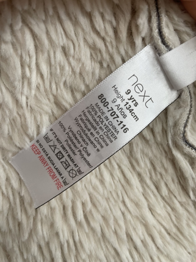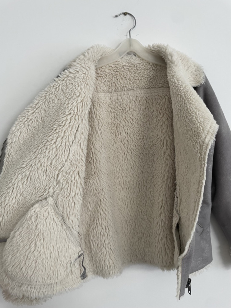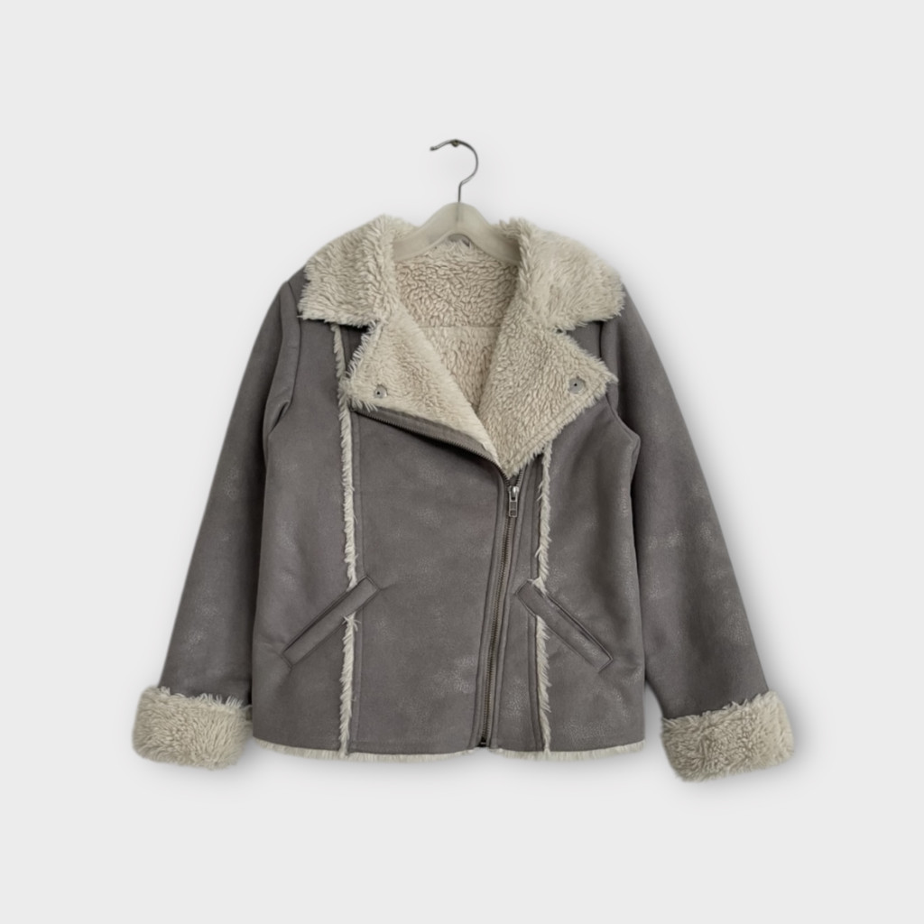 Szürke színű, belül pihe-puha kislány kabát 134-es méretben.