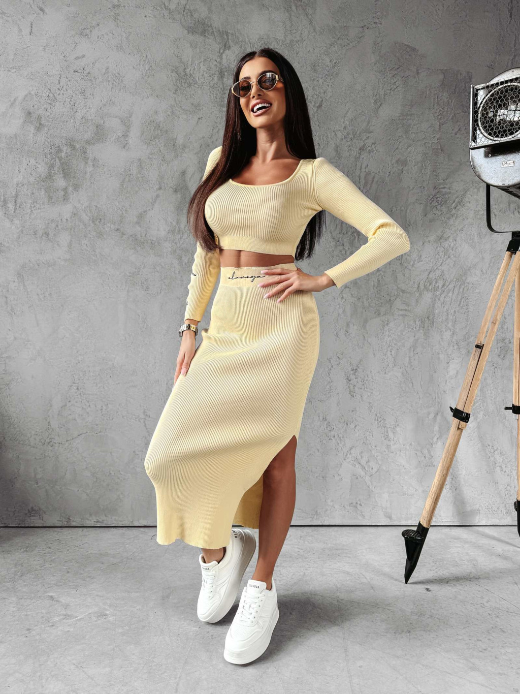 Sárga színű, bordázott anyagú, csinos női szett.