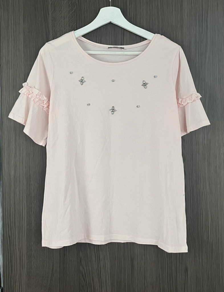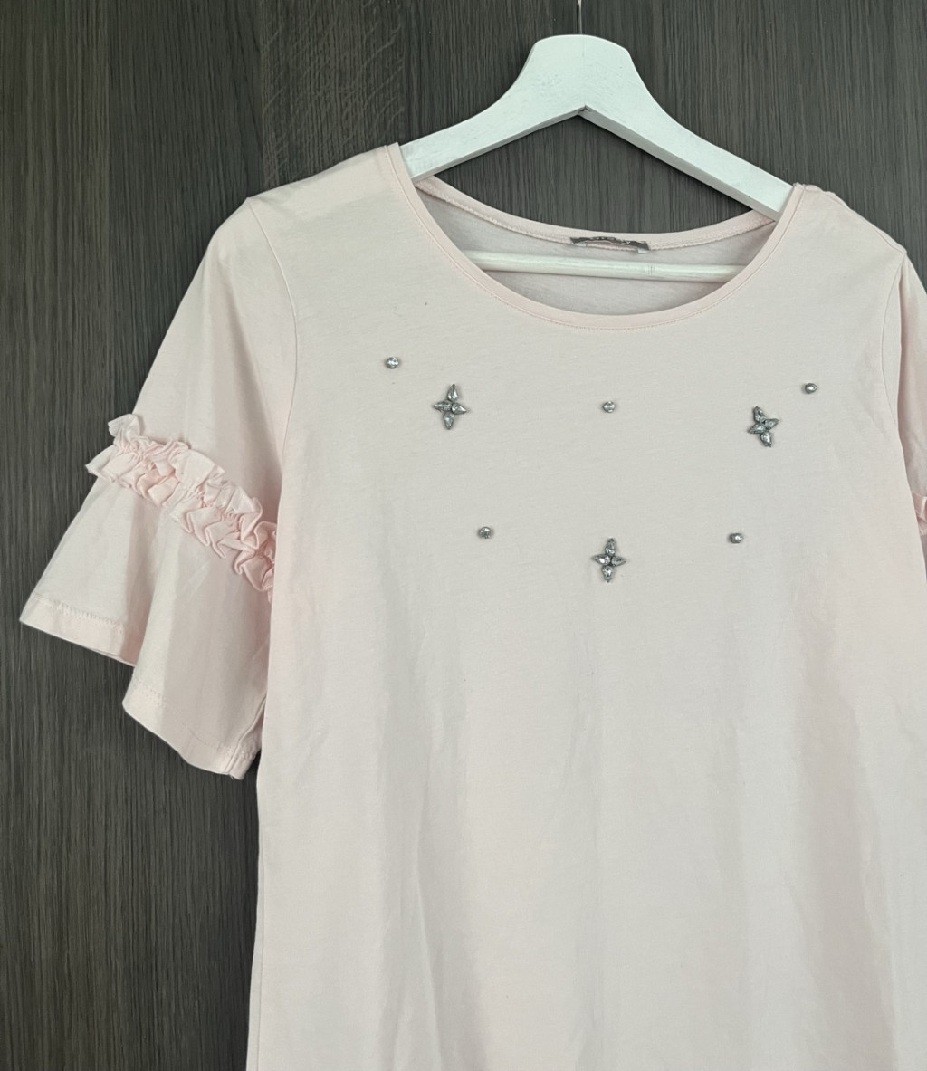 Halványrózsaszín, strasszkövekkel díszített, fodros ujjú női felső M-es méretben.