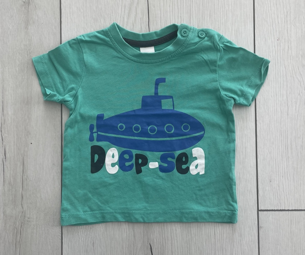 Nyomott mintás kisfiú póló 68-as méretben.