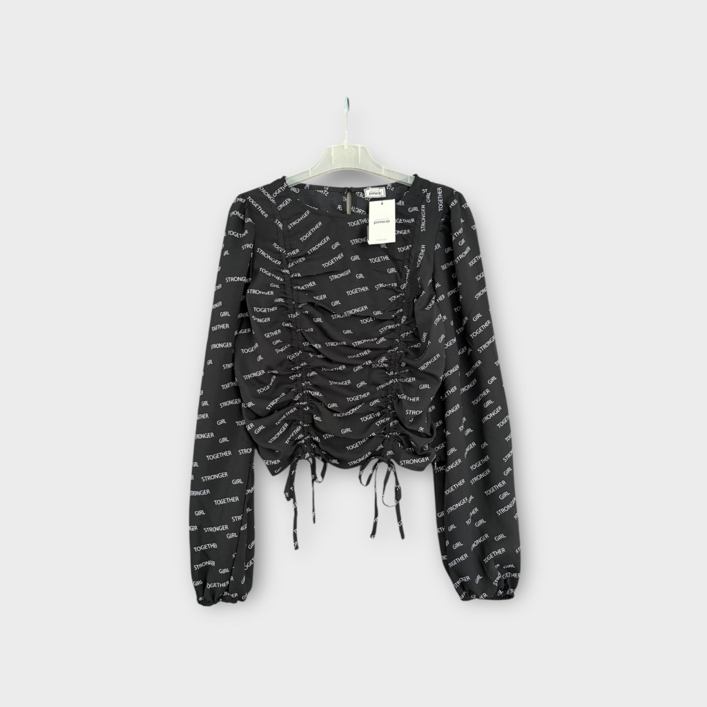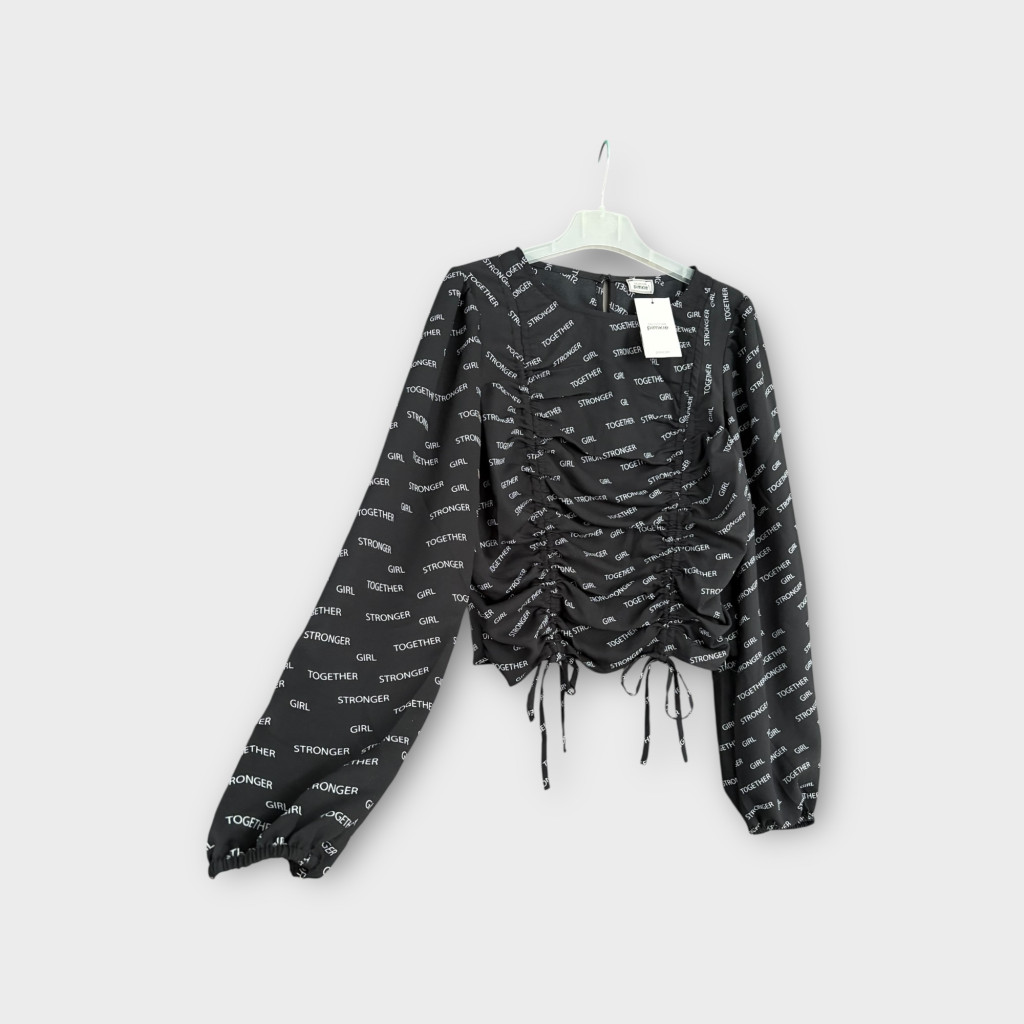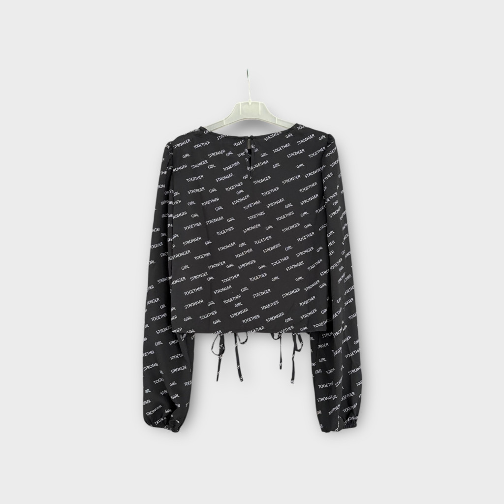 Rövid fazonú, feliratos női blúz. A beleírt méret 38, de inkább 36-osra ajánljuk.