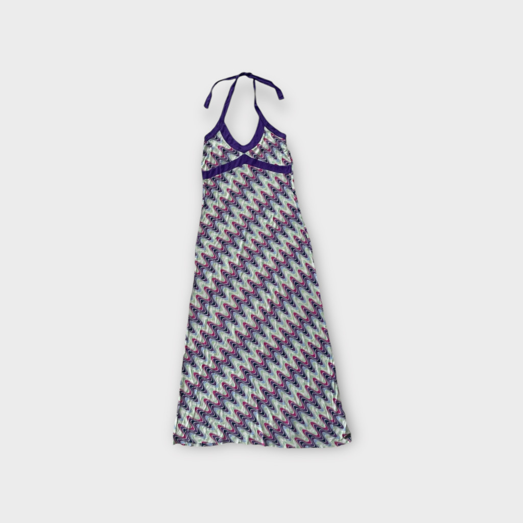 Nyakbakötős hosszú mintás ruha M-es méretben.