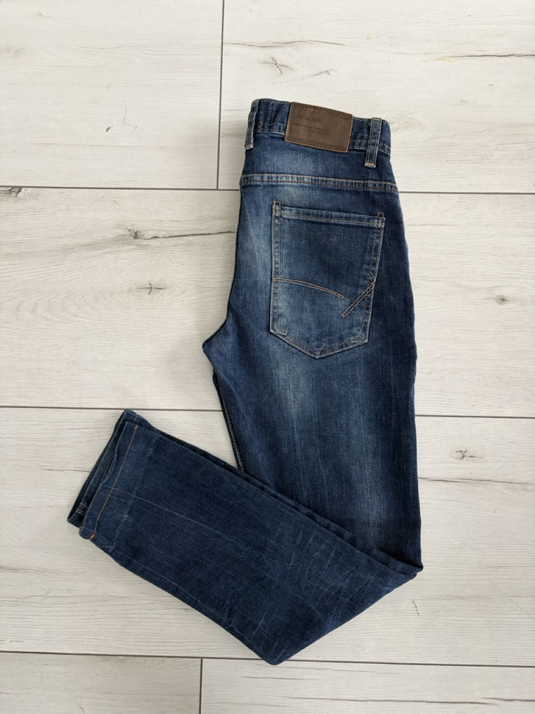 Sötétkék, koptatott női farmernadrág M-es méretben.