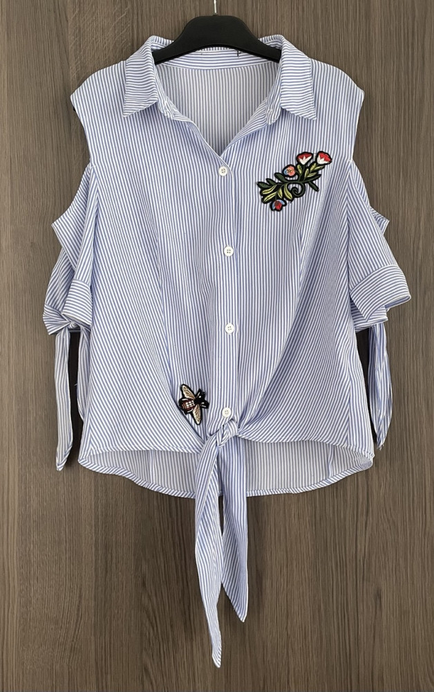 Nyitott vállú, csíkos, hímzett női ing S-es méretben.