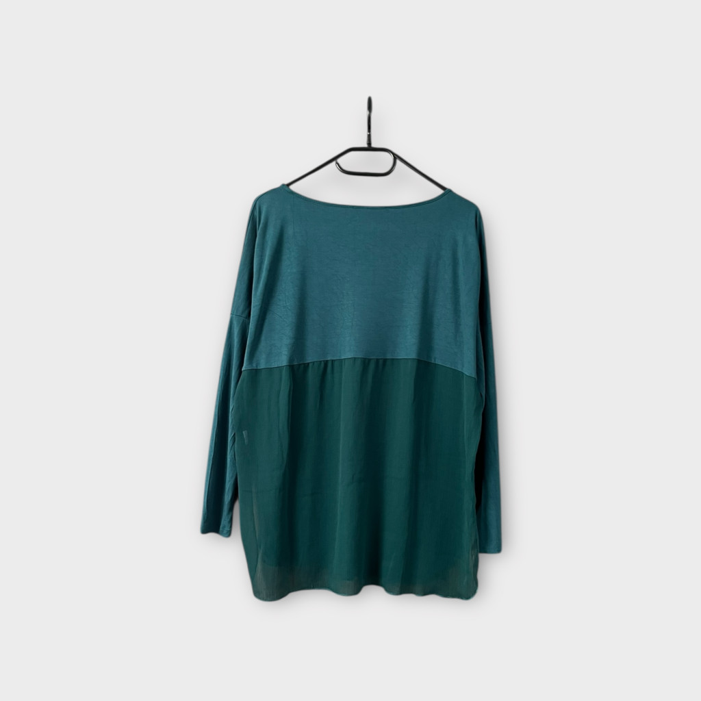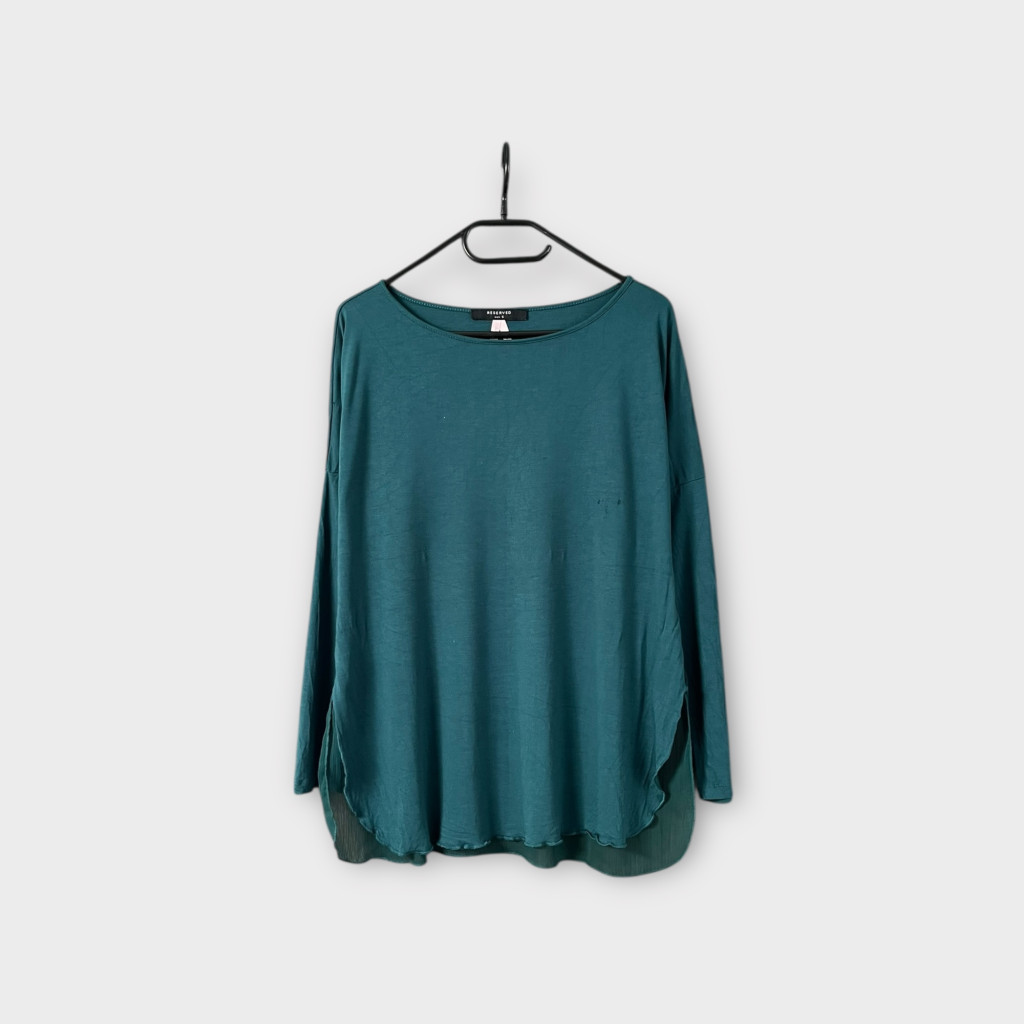 Bő fazonú, hosszított női felső. A beleírt méret S, de inkább M-es méretre ajánljuk.