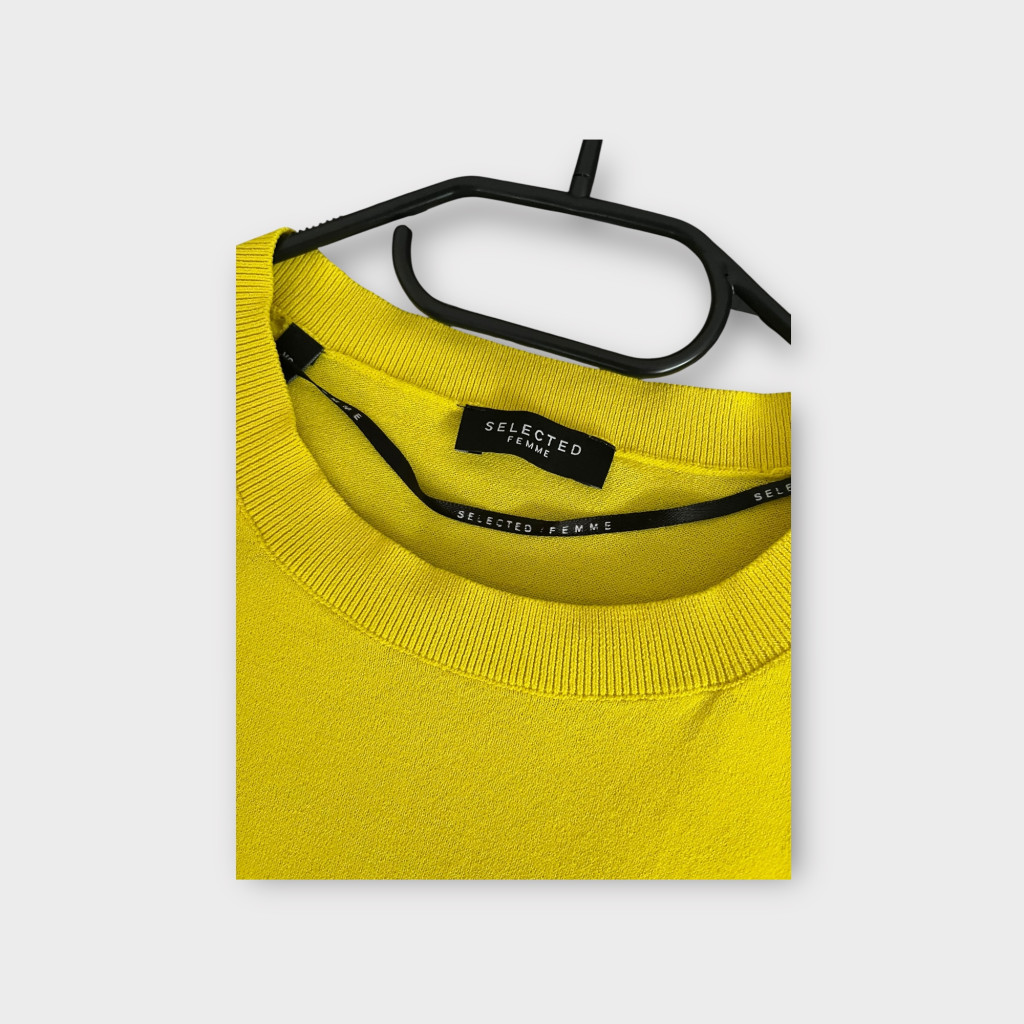 Bő fazonú, sárga női pulóver XS-es méretben.