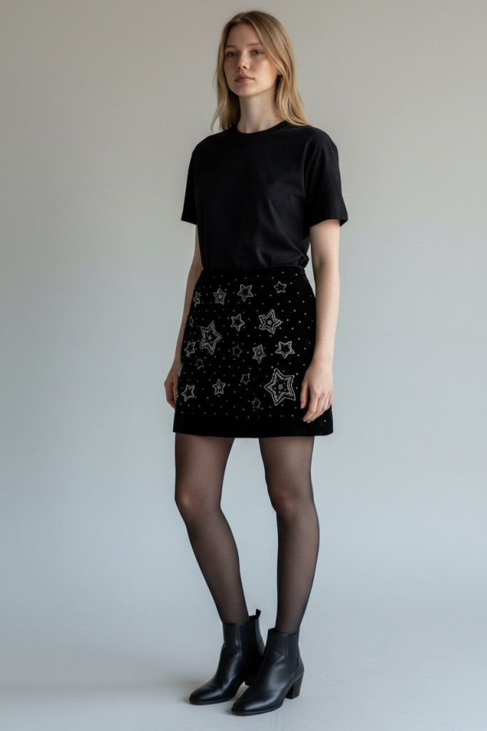 Fekete bársonyszoknya gyöngyös díszítéssel, 40-es méretben.